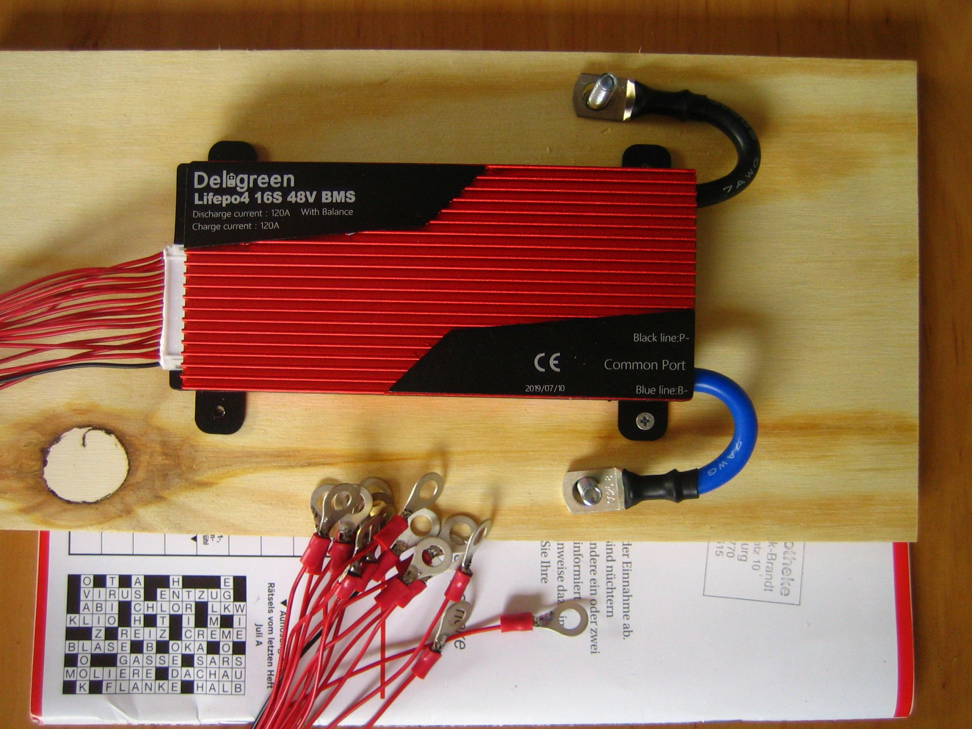Ich habe danach 2 Stunden lang mit 10A, also gut 1,6kWh, nachgeladen bis ca. 3,4V Zelle. Die Zelldrift verringerte sich im Balance Mode auf nur noch 0,006V. Ich bin nach wie vor vom JK-Balancer überzeugt - nur es ist halt kein BMS und ich überlege bis Frühjahr zusätzlich ein 24S BMS einzubauen - Foto ist vom 16S BMS.