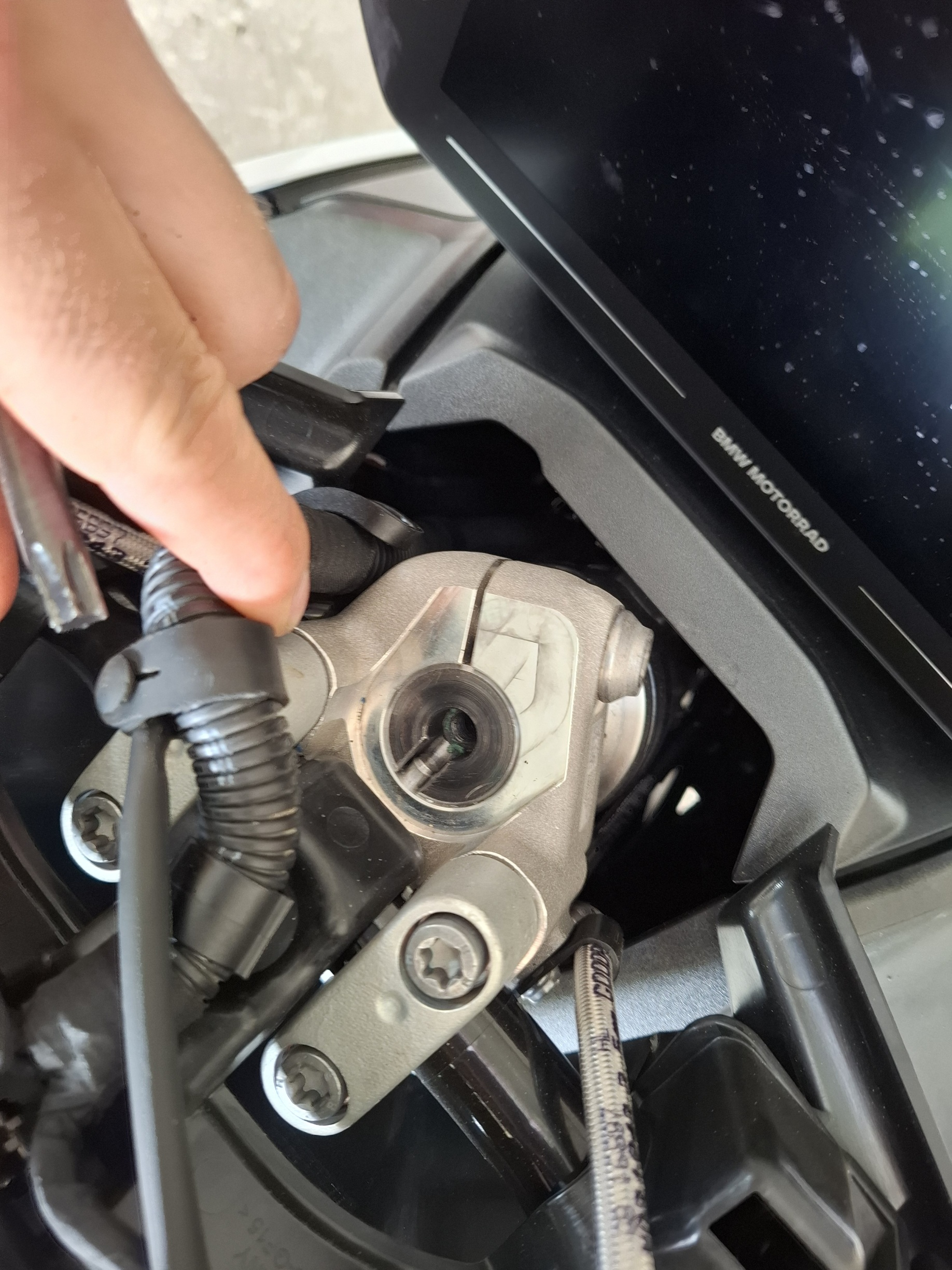 Dann noch ein ein paar weitere Fotos die vielleicht für den einen anderen hilfreich sind. Im Lenker ist tatsächlich ein Stift der die Position schon festlegt. Schrittweises verstellen, wie ich meine irgendwo gelesen zu haben, geht nicht. Aber der Stift hat zumindest etwas Spiel in der Nut, so das ich den Versatz zumindest auf ca die Hälfte reduzieren konnte. Ganz weg ging es leider nicht, dazu müsste man den Stift oder die Nut etwas anschleifen...aktuell lass ich es mal so.