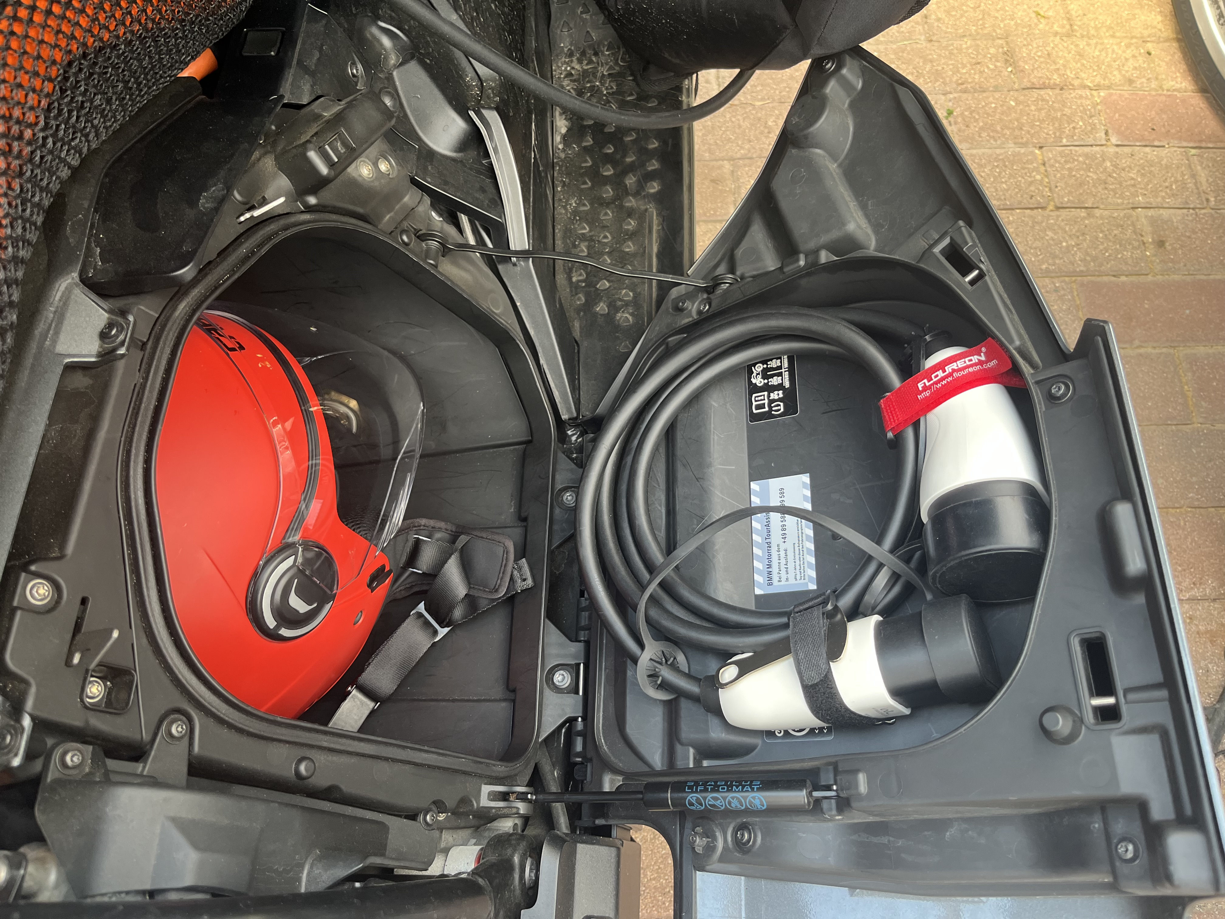 - Das Typ2 Kabel von Wireload im Deckel, so ist es immer dabei und ein Helm passt trotzdem rein. Danke an das Forum für Hinweis auf das Wireload Kabel!