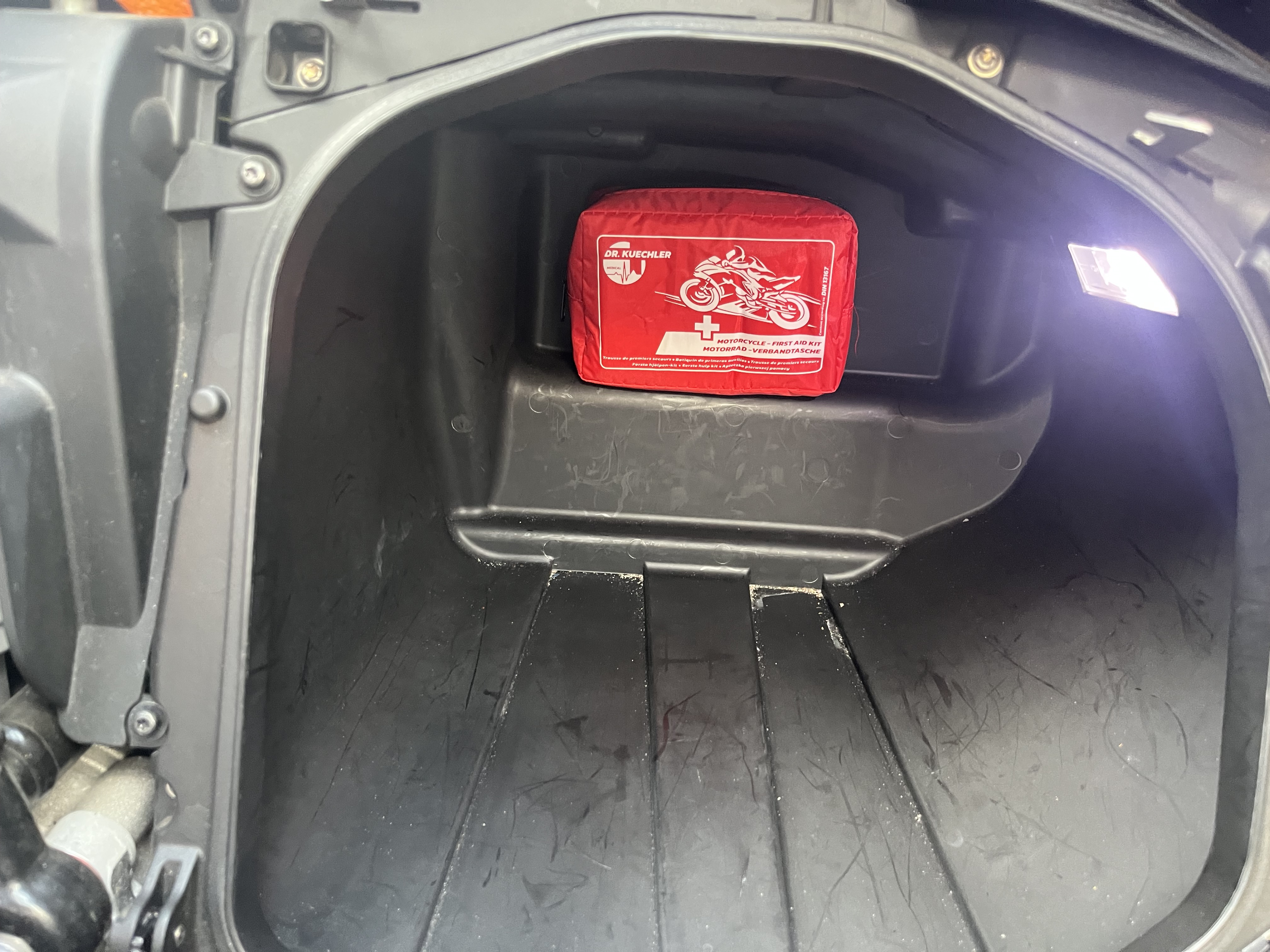 - Erste Hilfe Set ist immer dabei, Magnet mit doppelseitigem Klebeband an der Rückwand vom Helmfach plus Blechle im Set. Die Aussparung ist wie dafür gemacht.