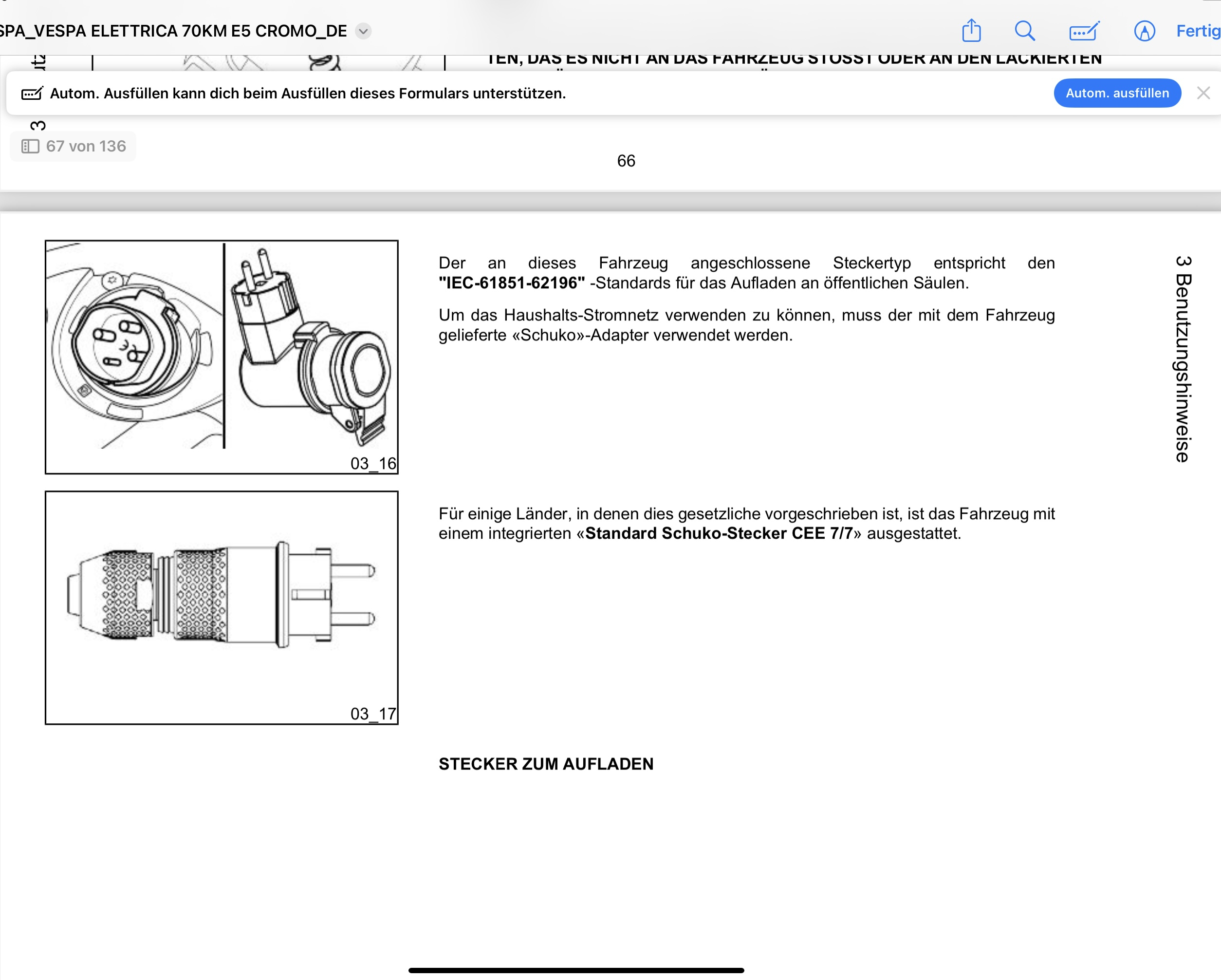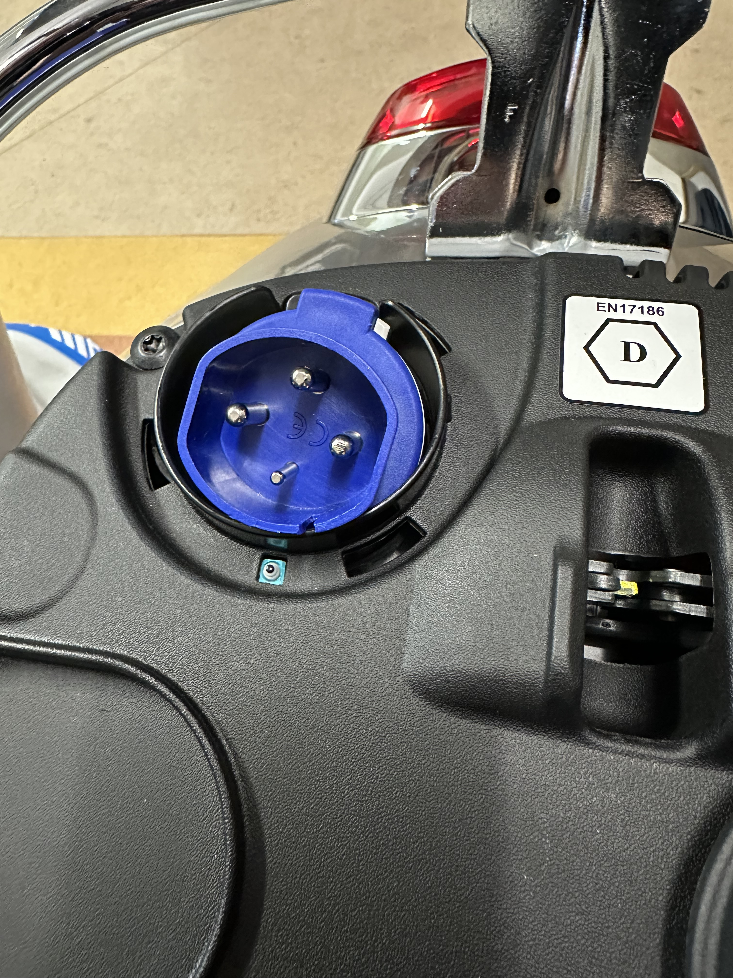 Dann finde ich sehr komisch das die Vespa so einen komischen Ladestecker hat, vermutlich eine italienische Variante. Es ist ein blau-ovaler Ladestecker, kein Schuko-Stecker, siehe Link: