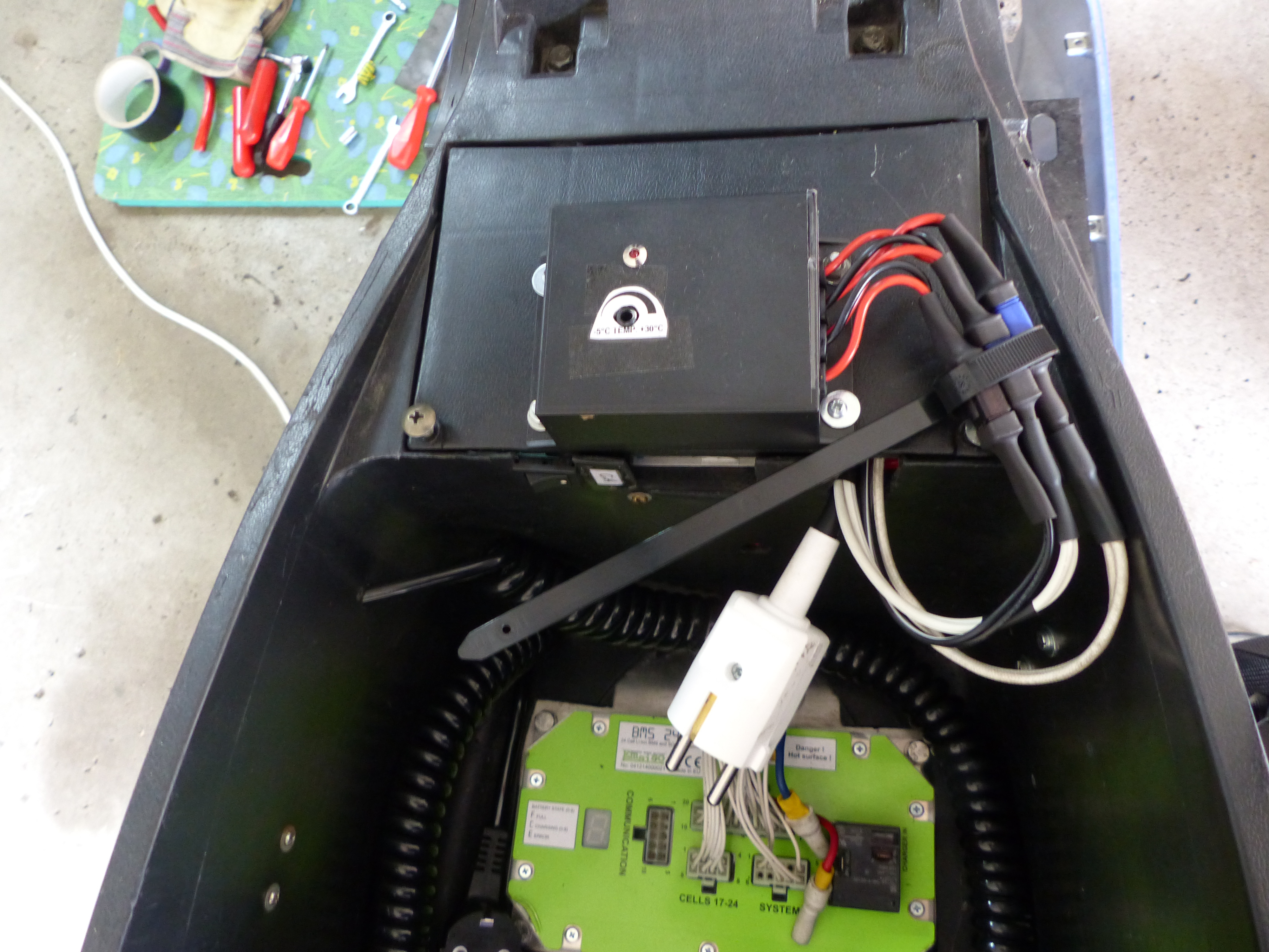 Und hier meine Ansicht auf die rechte Seite vom Rahmen und Helmfach. Hintern überm Hinterrad der DC-DC-Wandler für die autarke Batterieheizung, seitlich am Helmfach außen das Meanwell Netzteil für den Netzbetrieb der Heizung. Die Heizung war eine für mich passgenau in China gefertigte Silikon-Heizmatte mit 100W bei 12V, die ich allerdings mit 13,5V betrieben habe.