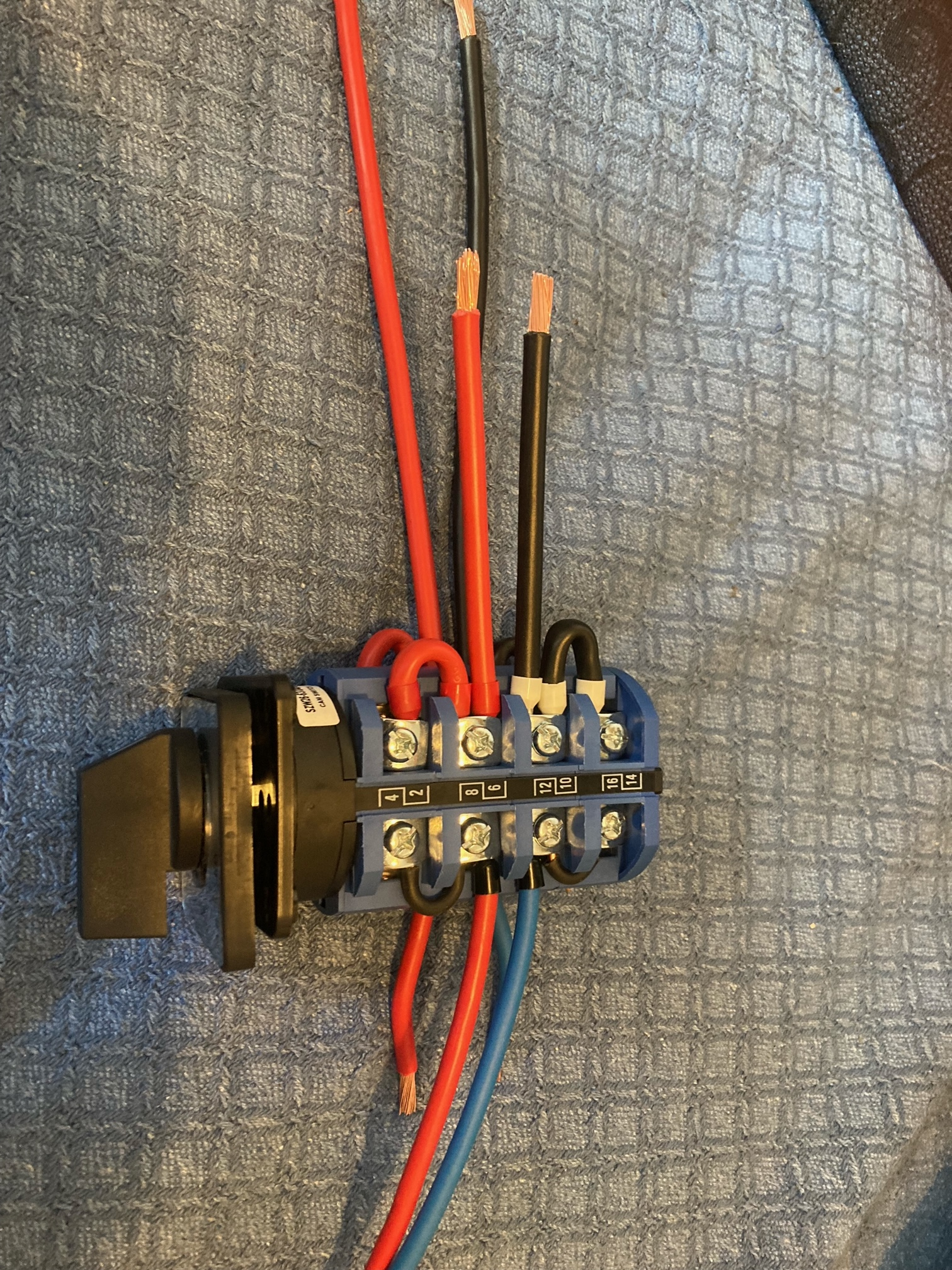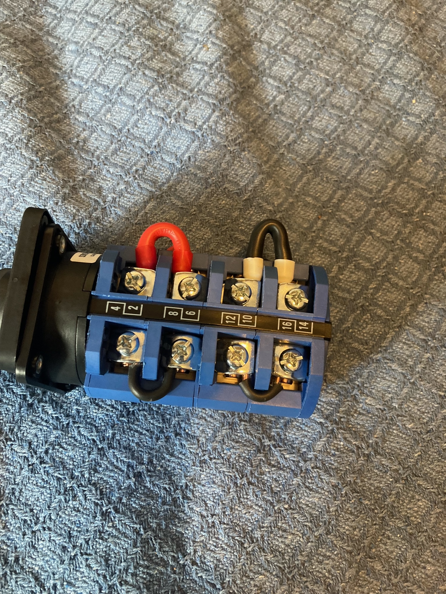 1 Stk. 4-poliger Umschalter, 5 Stecker, Litze 16mm², Litze 6 und 10mm² (was halt rumlag) und für 2 der Brücken Massivader 4mm² weils grad passte.