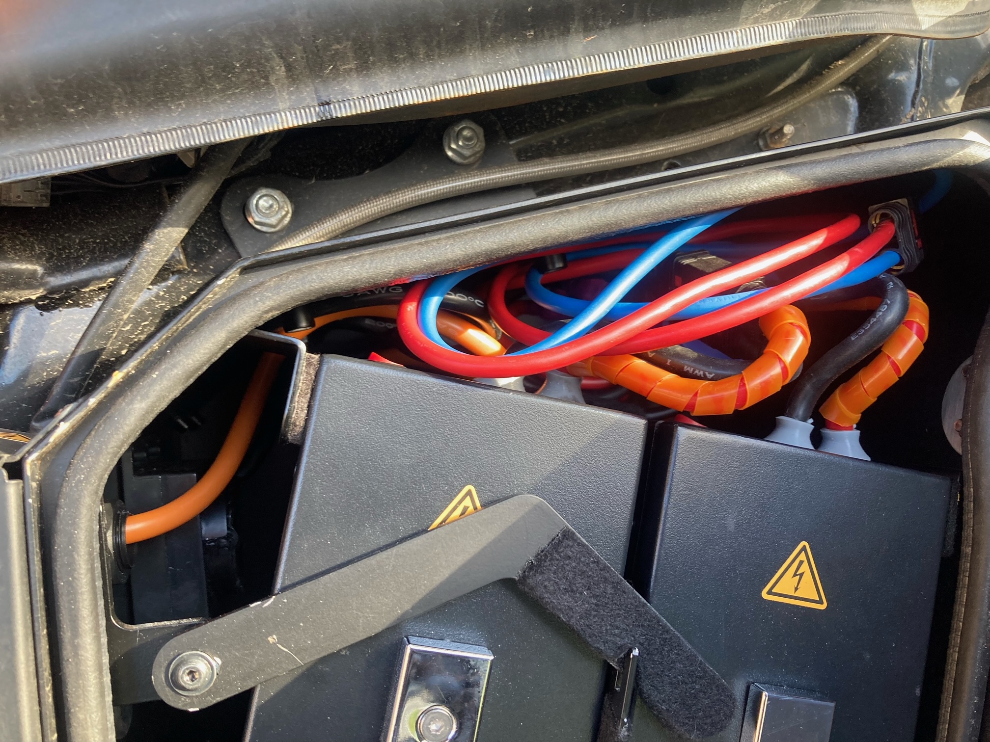 Mir war halt wichtig, nichts (außer ein paar Montagelöchern) am KRAD zu verändern. Jedes abgekniffene Originalkabel rächt sich spätestens im nächsten Herbst.