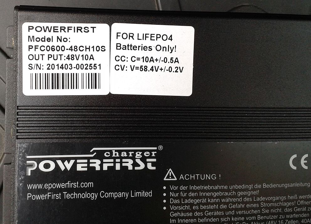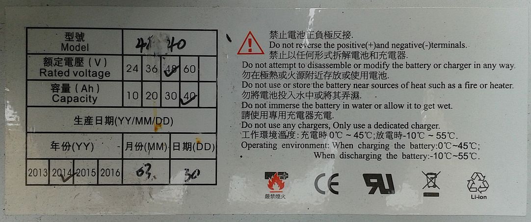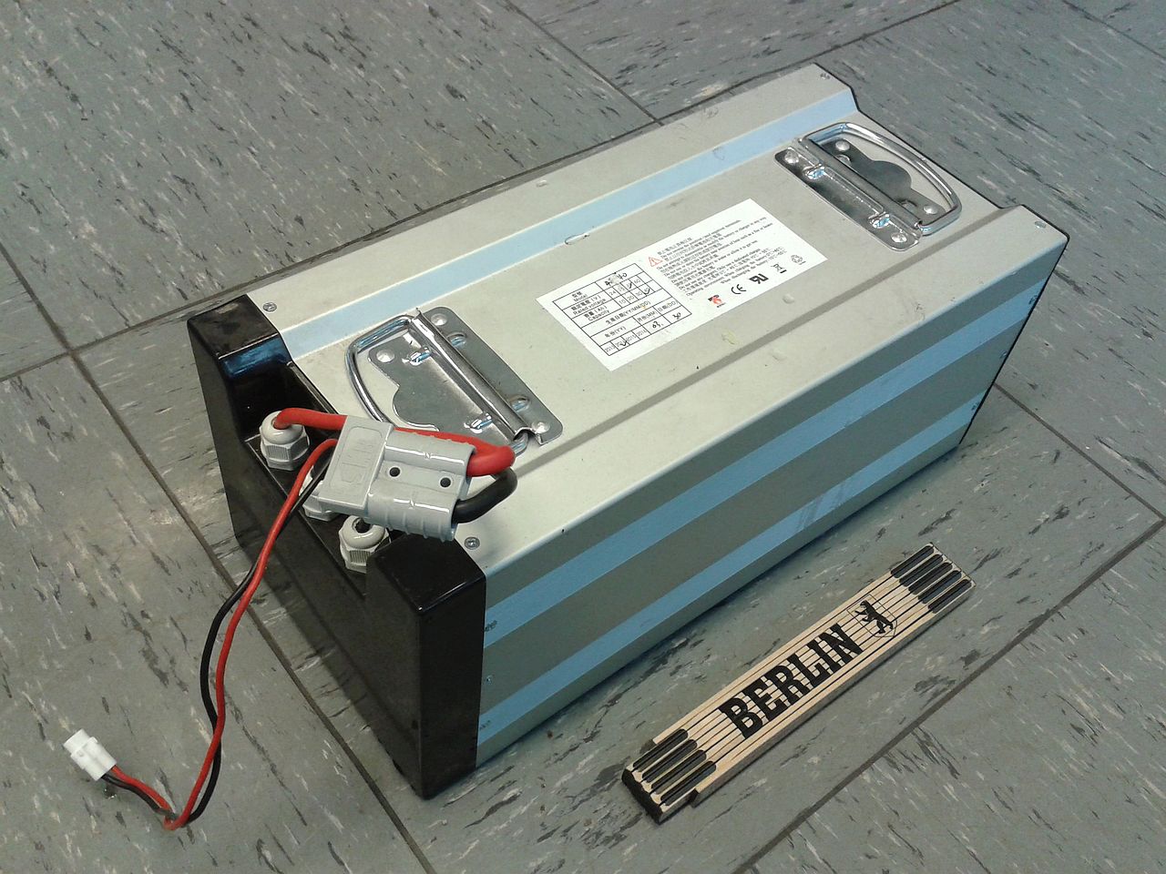 - Akku: 16 Einzelzellen LiFePO4 (Lithium-Eisenphoshat) Akku mit BMS (Batteriemanagementsystem) ordentlich verpackt in Alukiste mit Griffen. Ein Anschluss für den Antrieb und ein extra Anschluss für's Ladegerät. Die Nennspannung wird allgemein bei 16-zelligen LiFePO4-Akkus mit 48 Volt angegeben, liegt aber bei 3,2 bis 3,3 Volt Nennspannung einer LiFePo4-Zelle tatsächlich etwas höher bei rund 52 Volt. Die Ladeschlussspannung liegt bei 16 x 3,65 Volt = 58,4 Volt. Die Entladeschlussspannung liegt bei 16 x 2,8 Volt = 44,8 Volt. An beiden Punkten schalten das Ladegerät bzw. der Controller/BMS zuverlässig (und ohne Vorwarnung) ab. Die Spannungen sind gut gewählt, um ein langes Akkuleben zu ermöglichen. Besonders bei der Entladeschlussspannung wurde genug Reserve gelassen um eine schädliche Tiefentladung einzelner Zellen zu vermeiden und im gleichen Zuge die mögliche Zyklenanzahl zu steigern. Ein vorsichtiges öffnen des Akkugehäuses zeigt höchstwahrscheinlich die in silberfolie eingeschweißte LiFePO4-Zellen (optisch gleich wie die LiPos aus dem RC-Bereich) und nicht wie erwartet prismatische Einzelzellen im gelben, grünem oder blauen Kunststoffgehäuse (z.B. Winston). Nach dem Öffnen der ersten Schicht aus Kunststoffplatte und folgender Moosgummiplatte, in die die Zellen zum Schutz eingepackt sind, habe ich mich nicht getraut, den Akku weiter zu zerlegen. Da sich die eingepackten Zellen samt BMS nicht einfach aus dem profilierten Alugehäuse herausschieben ließen, habe ich die Aktion vorsorglich unterbrochen, damit ich nichts zerstöre und mich am Ende schwarz ärgere... Wer kennt das nicht?