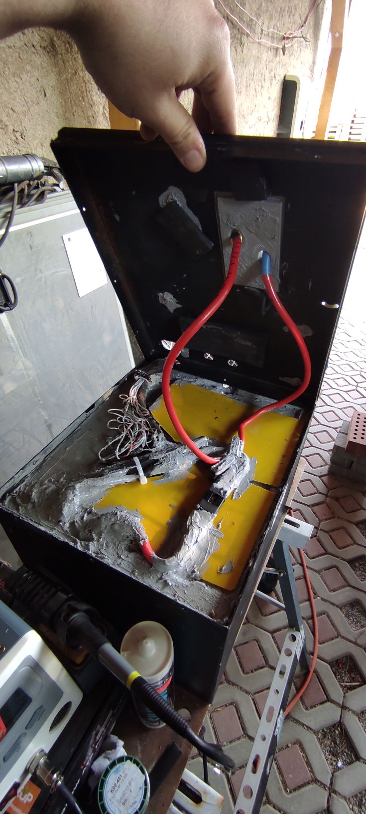 Im Akku habe ich eine 150A Flachsicherung in den Kabelstrang eingelötet und alles entsprechend eingekittet. Um Schwitzwasserbildung zu verhindern, hat der Akku Luftlöcher oben, da er in seiner Bauweise eh nicht dicht zu bekommen ist.
