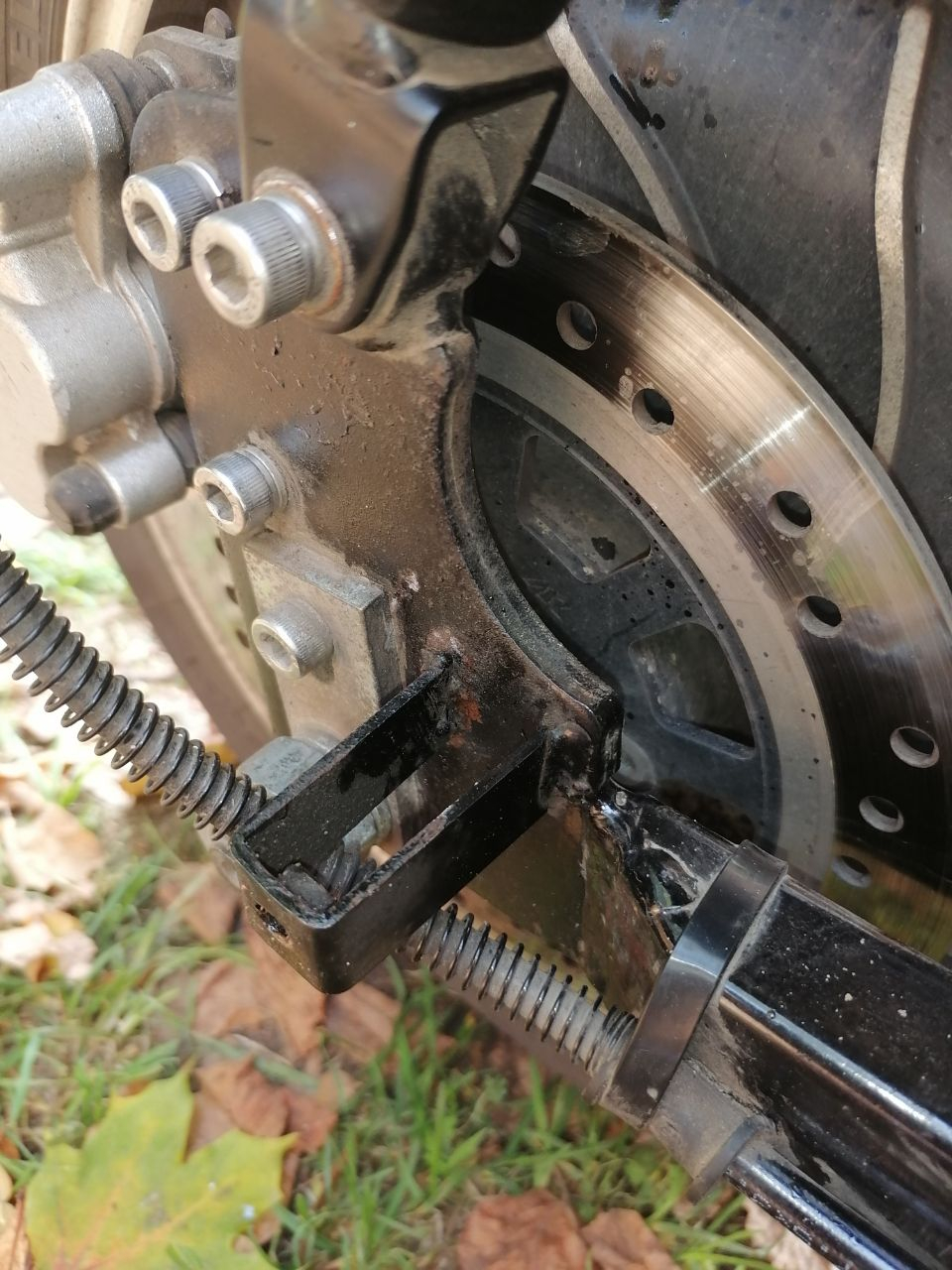 Tatsächlich beschränkt sich der Rost auf die Teile, bei deren Ansicht ich im Frühjahr Schlimmstes erahnt hatte. Die Schwinge ist pickelig und das Gabeljoch hat etwas Flugrost, auch die Ständer. Aber die sind auch exponiert. Die Rahmenrohre unter der Verkleidung und von unten hingegen fast nichts, hier und da, wo etwas gescheuert hat und hier und da Minipunkte in Mulden an Schweißpunkten: