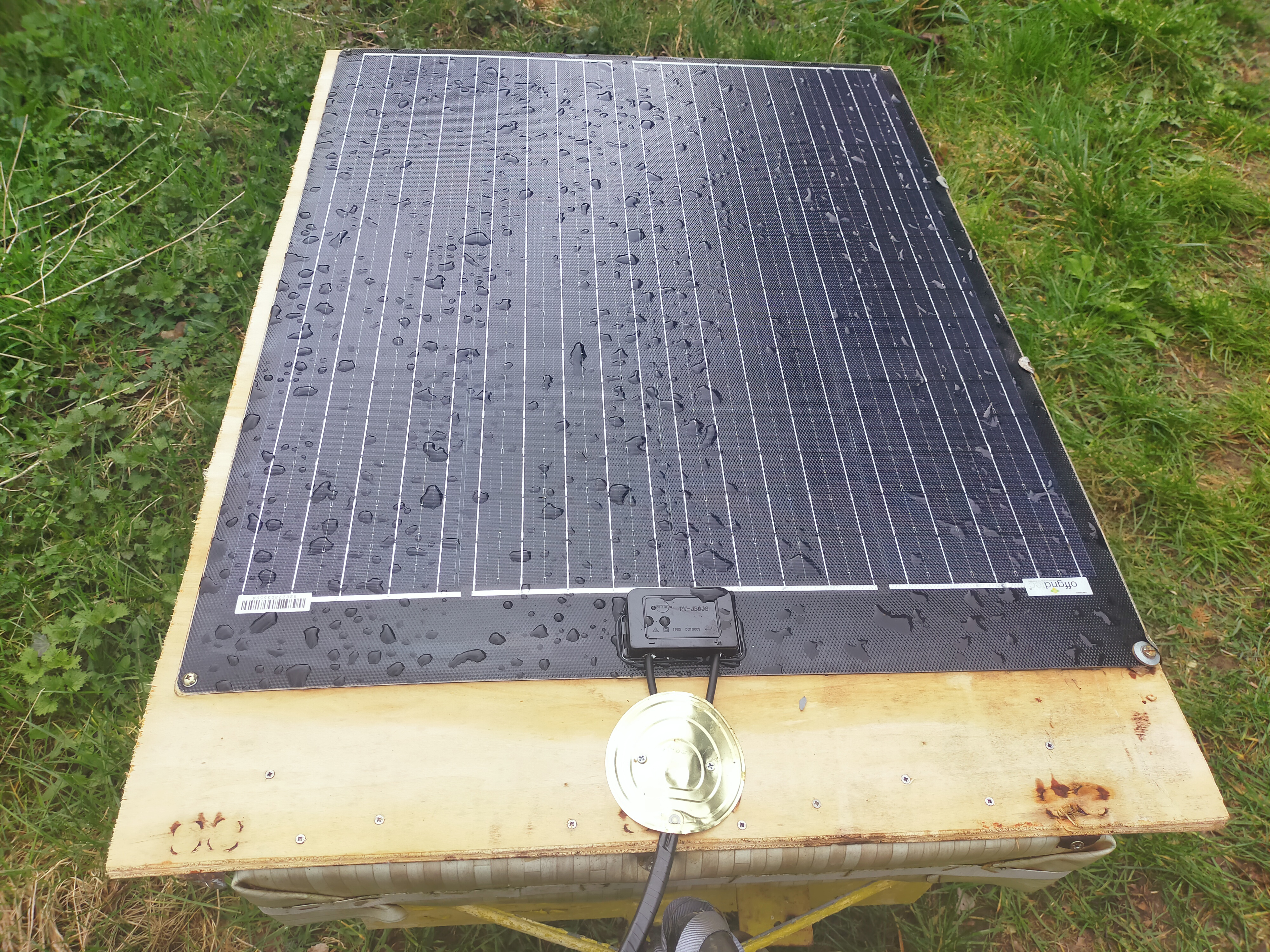 Gestern brachte ich das 24 V Solarmodule auf dem Anhänger an, indem ich es auf eine zuvor angeschraubte Sperholzplatte mittels Saugnapf-Klebeband ( es ist kein Klebstoff, sondern eine im Nanobereich haftende Saugnapfverbindung). 14 Meter beidseitig haftendes Saugnapfbrand brachte ich auf die Rückseite des Solarmodule an und drückte das Solarmodule auf die Sperrholzplatte und verschraubte die vier Ecken des Solarmoduls mit der dünnen Sperrholzplatte. Heute führte ich die Verkabelung mittels einer Kaltgerätesteckdose, die ich aus einem Computer Netzteil ausbaute, und einem Kaltgeräteverlängerungskabel aus. Der gestern neu verbaute 72 V Mppt boost stepup Laderegler lädt bei stark bedecktem Himmel mit 0,3 A die 72 V 62 A Bleigelbatteriebank. Siehe Fotos. Leider lassen sich andere Foto mit 6 bis 7 MB nicht ins Elektrorollerforum hochladen, da zu groß.