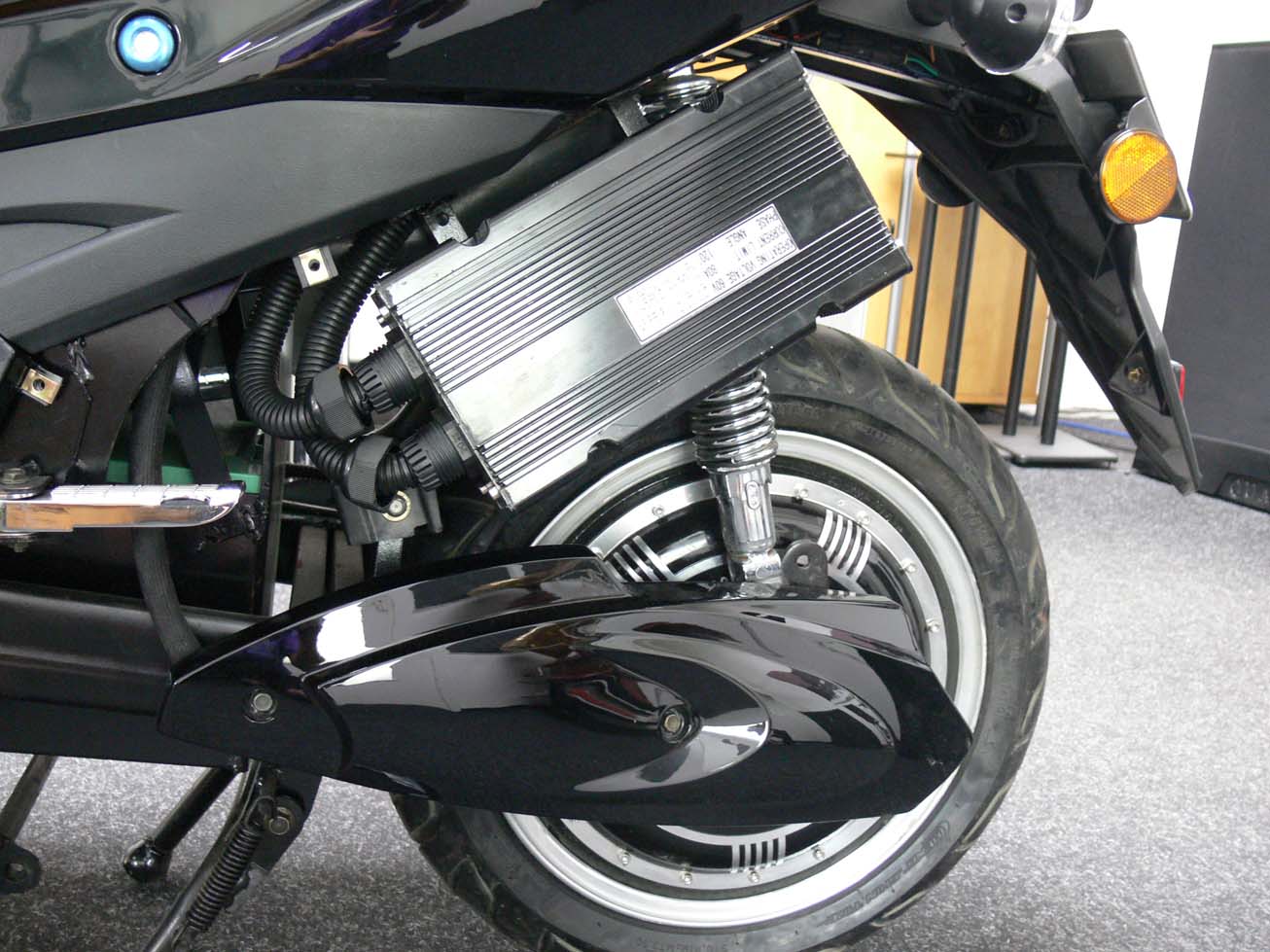 Dieser Roller wurde übrigens nicht von einem Benziner abgekupfert, sondern als E-Mobil direkt so konstruiert. Das sieht man an der geschickten Art der Unterbringung der AKKUS. Die fünf GREENSAVERs stehen in einer Reihe optimal von der Gewichtsverteilung in einer dafür vorgesehenen unteren Wanne. Die Kabel zu den Akkus sind dick und an den Schraub-Punkten optimal gegen Wasser und Korrosion mit Silikon-Hauben geschützt. Bin echt von den Socken, wie sauber das Alles verarbeitet ist. Der komplette Kabelbaum sieht ebenfalls gut dimensioniert aus für diese Leistung. Habe ja nur die 60V Variante. Den gibt es dort auch mit 72V und sogar schon mit 84 Volt (110km/h). Der Controller ist vom Herstellungsdatum 11.05.2010, somit auch flammneu. Der scheint auch aus eigener Pruduktion zu sein und wird vermutlich nicht zugekauft, da keine Fremdtypenbezeichnung draufsteht. Der 5KW Motor selbst sieht aus wie ein Kelly. Ein tolles Gerät wenn er dann auch fahren würde. Bei dem Gewitter gerade draussen macht das Basten und Forschen mehr Freude als das fahren. Warte immer noch auf das okay von GK den Controller zu öffnen. Die Techniker sind heute wohl nicht da! Es kam nur diese Mail vom Vertrieb: