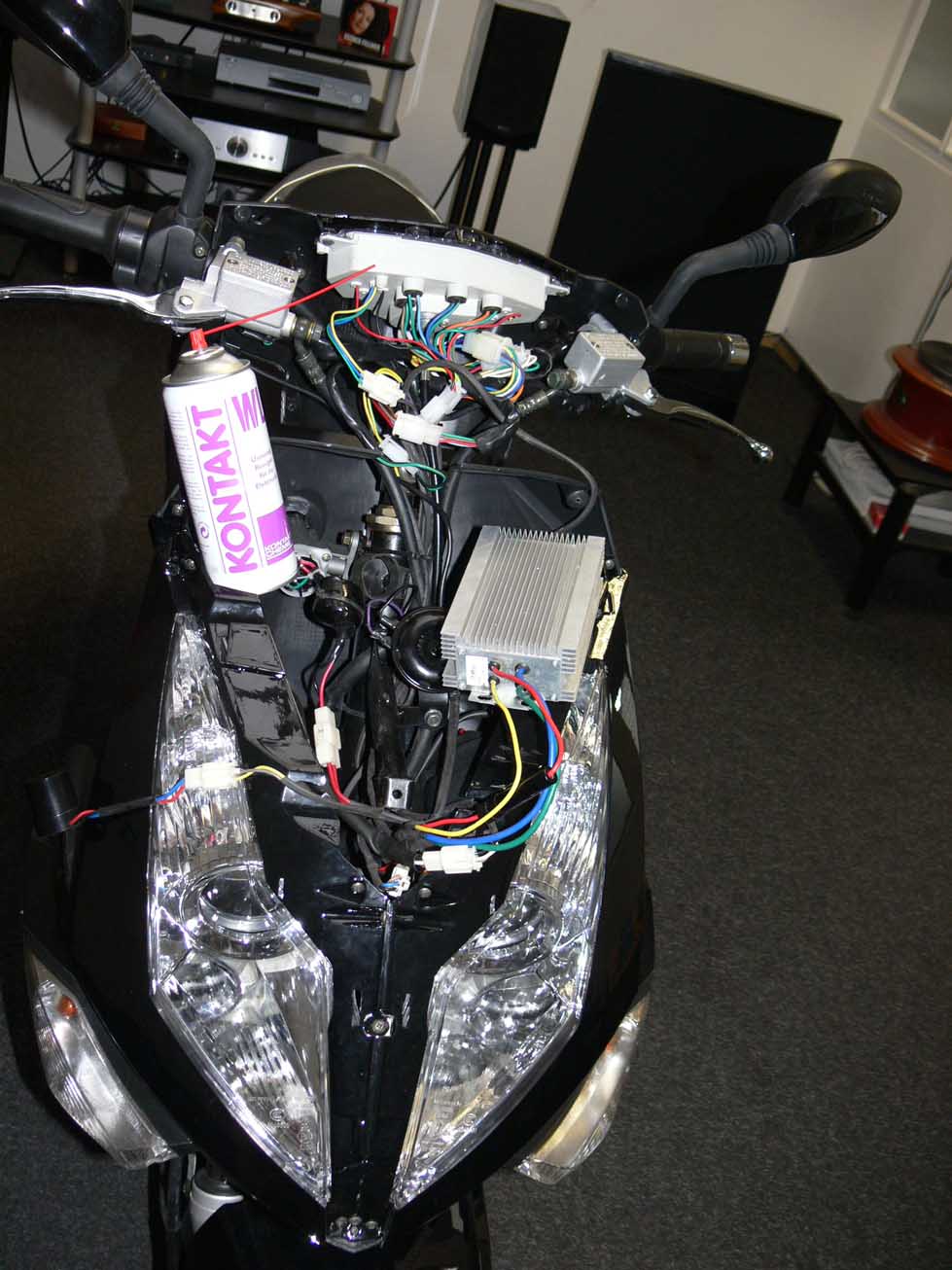 Hab den Roller erst mal in mein Büro gestellt und vorerst nur die vordere Blende entfernt (so kann ich Ihn wenigsten tagsüber sehen).