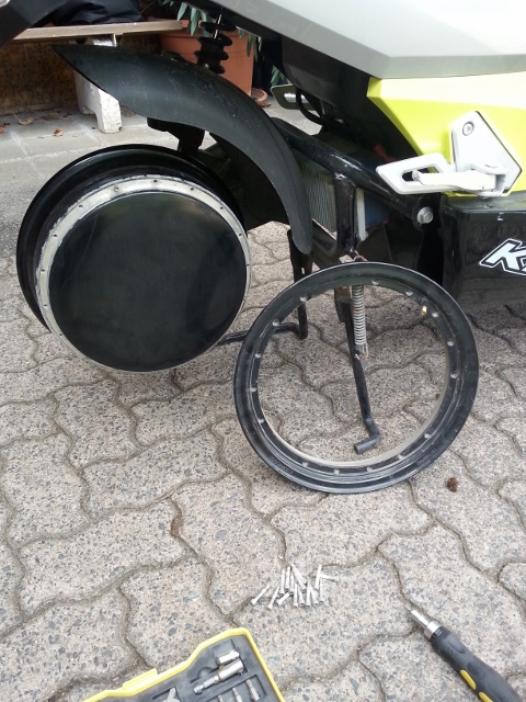 a. Der 13" Zoll single-shaft Motor wird in 2 Varianten gebaut: tube (mit Schlauch) und tubeless (ohne Schlauch). Beim tube Motor sitzen die Schrauben weiter am Rand und ein Felgenhorn läßt sich abschrauben. Beim tubeless Motor ist die komplette Felge über den Motor gestülpt.