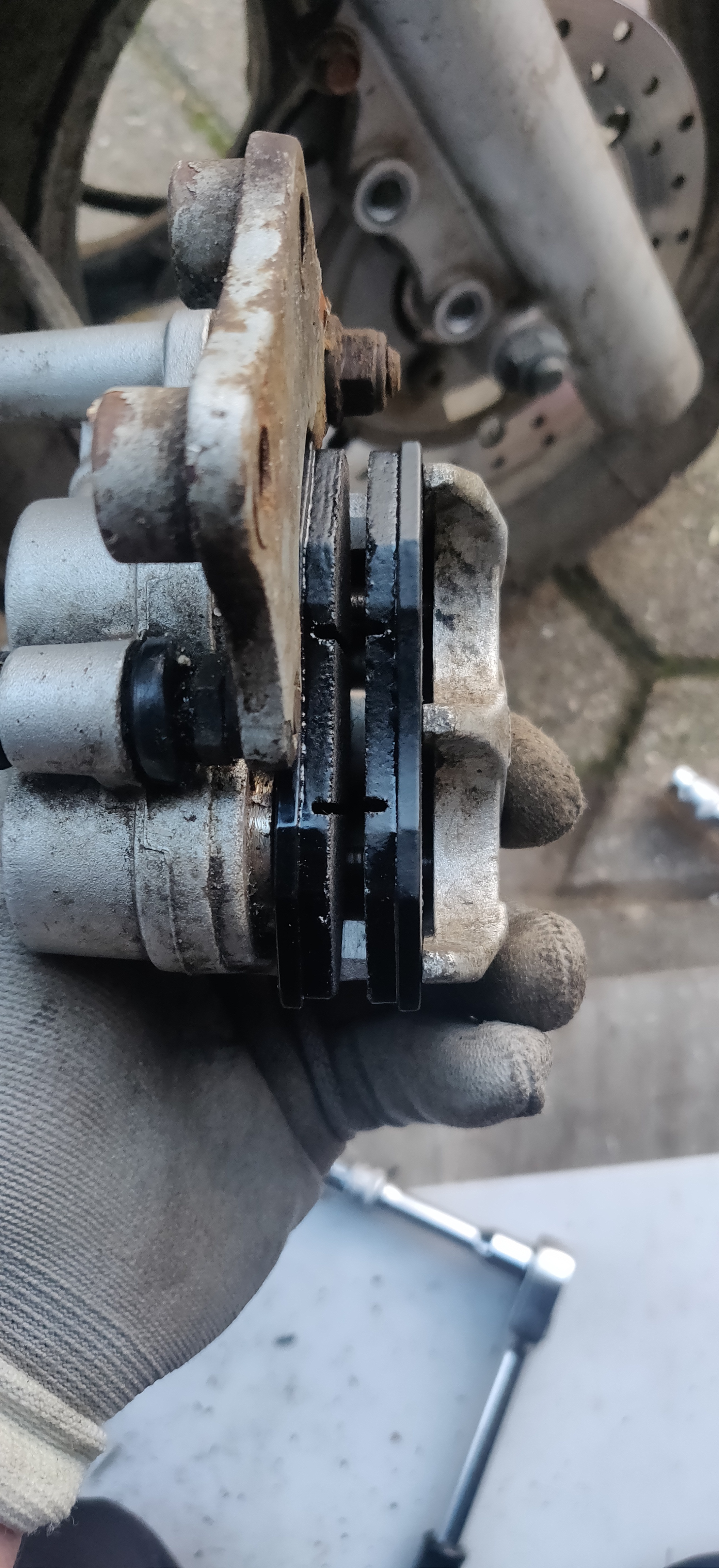 Rein vom Messen würde auch 9 mm passen. Sattel ist ganz drin, Scheibe hat 4,5 mm, der Schlüssel ist 8 mm.