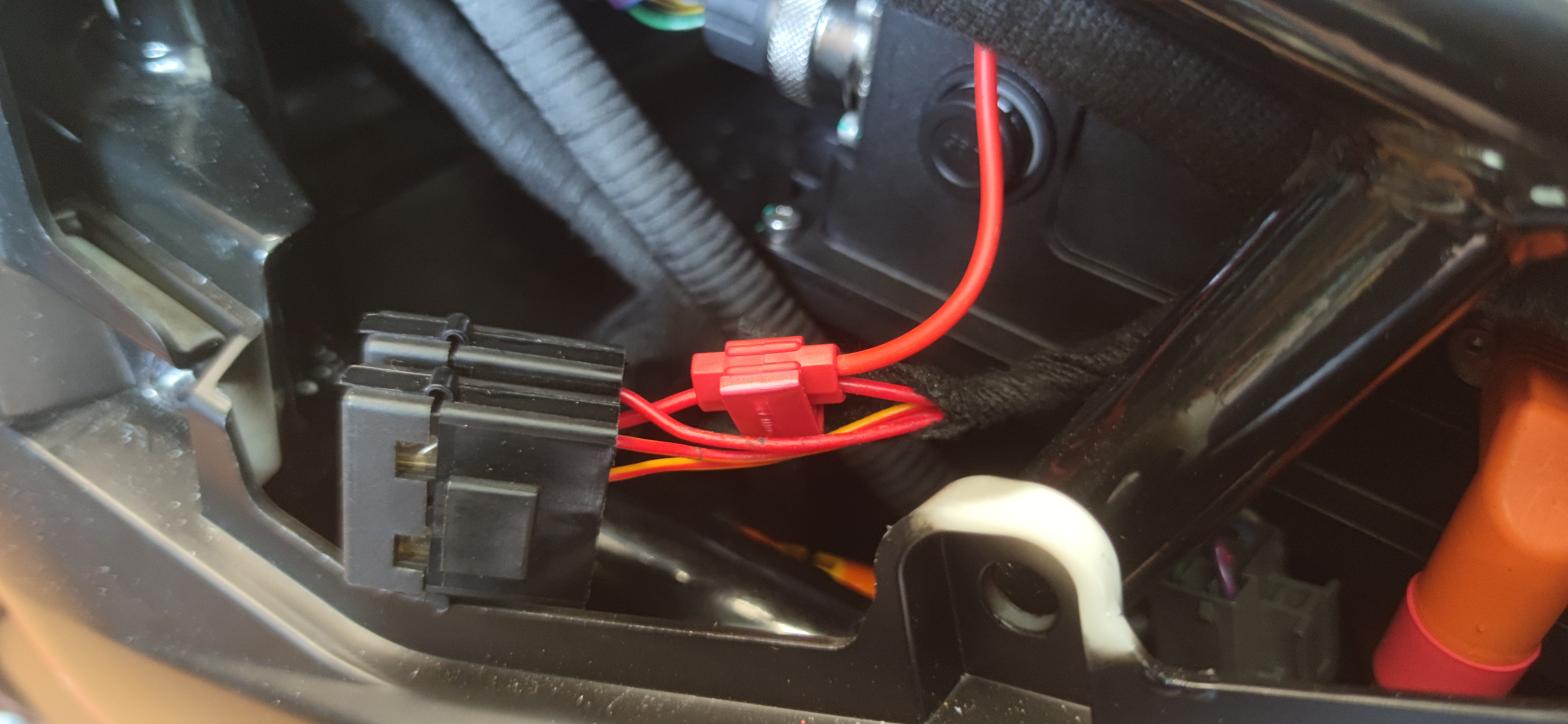 Am geschalteten Plus habe ich mit einem Abzweigverbinder (Stromdieb) die Plusleitung abgegriffen. Im Kabel von der USB-Buchse ist auch noch ein Sicherungshalter mit 10A. Die Sicherung habe ich gegen 3A getauscht, reicht vollkommen. Für Masse dann den Ringkabelschuh einfach mit der Schraube von der dreieckigen Blende mit befestigt.