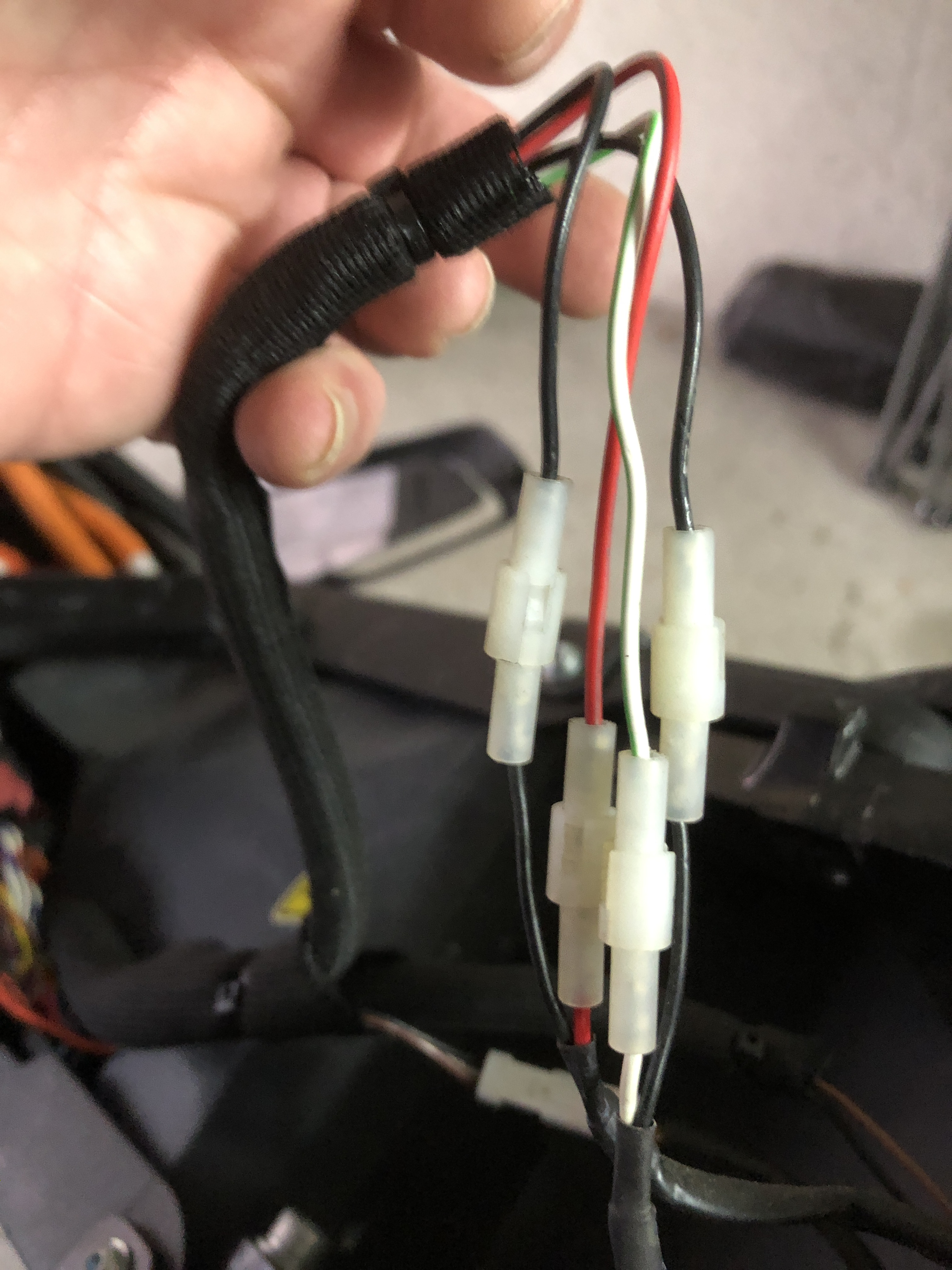 Und ist eine fürchterliche Plackerei!!! Speziell diese vier Blinkerkabel haben's in sich, denn sie müssen durch kleine Löcher ganz hinten im Heckbürzel nach unten raus- und hinterher wieder reingepfriemlet werden, weshalb lange (meine waren zu kurz...) Fäden drankommen sollten und im Loch verbleiben, so dass man die hinterher, nach dem Versetzten nach hinten, wieder besser durch die Löcher bekommt: