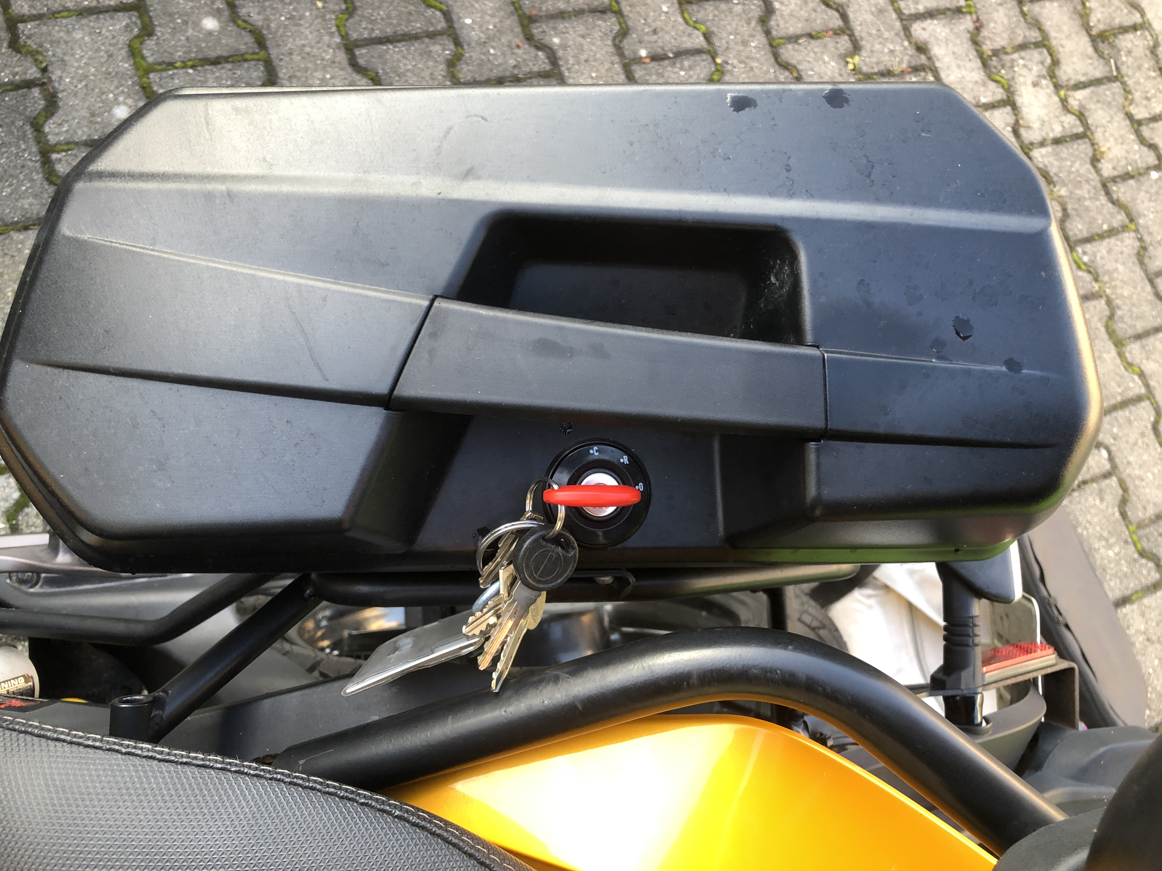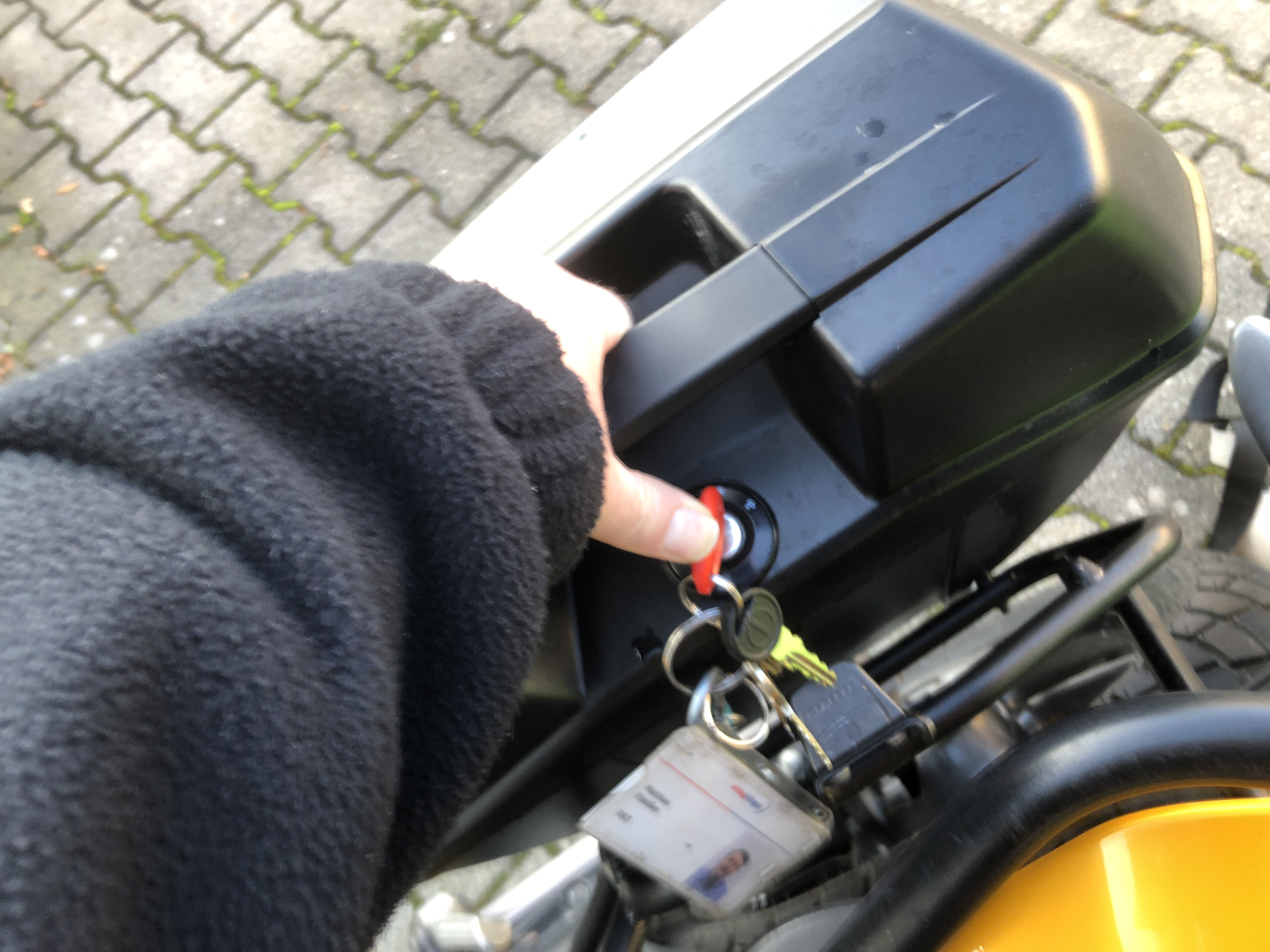 Weiter geht's! Die Koffer an sich haben das für Givi typische Monokey System. Wenn der Schlüssel 90° quer zur Fahrtrichtung steht kann er abgezogen werden. Abnehmen kann man den Koffer nach einer 45° Drehung, und man muss zum Entriegeln den Schlüssel samt Schloss nach unten drücken, dann kann man den Koffer seitlich abnehmen: