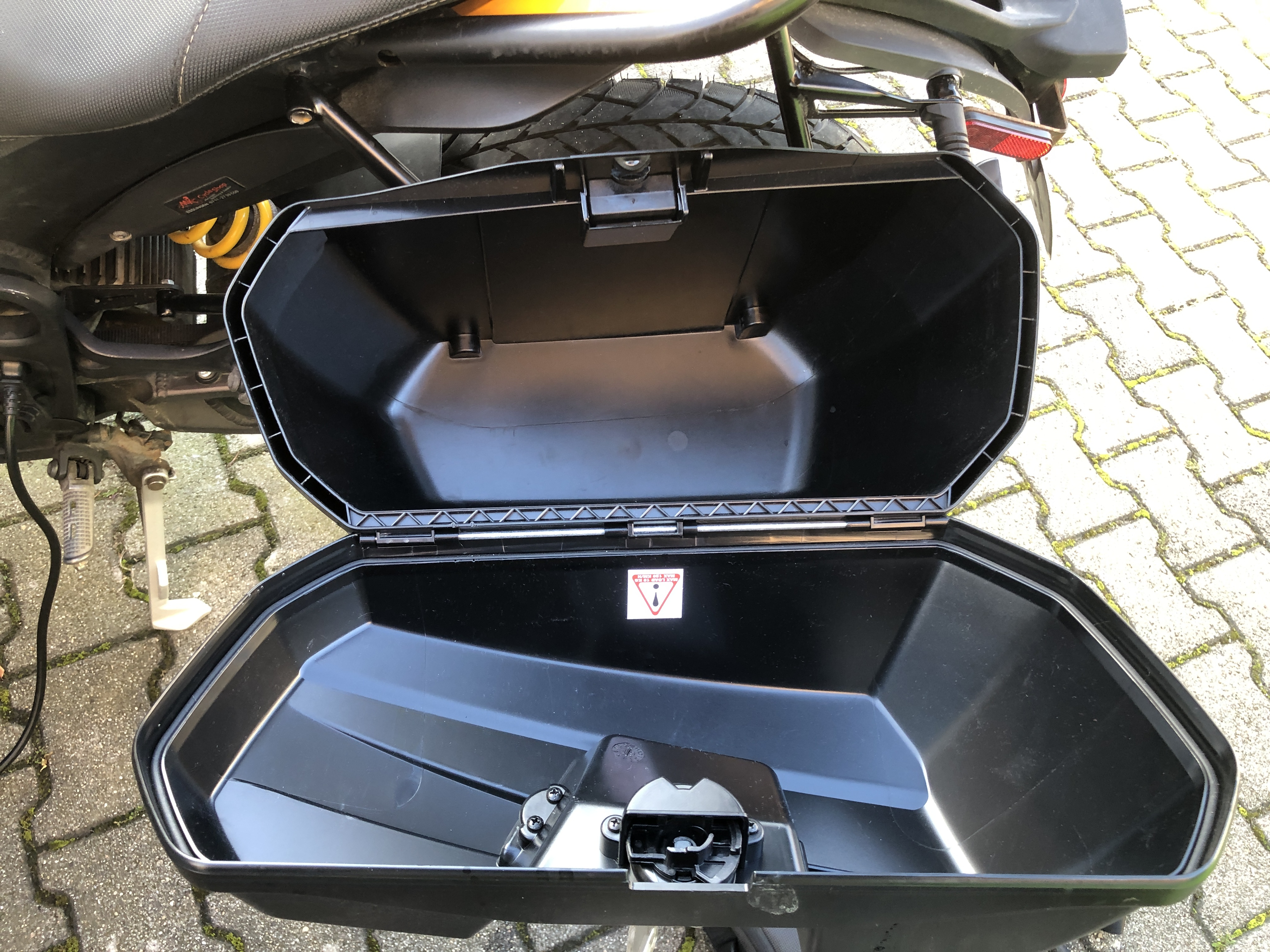 Der Blechhalter, der links unten den Seitenkofferrahmen abstützt, steht so weit in den Innenraum, dass er es unmöglich macht, den braunen Anderson Stecker eines Zusatzladers in den schräg nach unten links stehenden Gegenstecker über dem Motor einzustecken :evil: