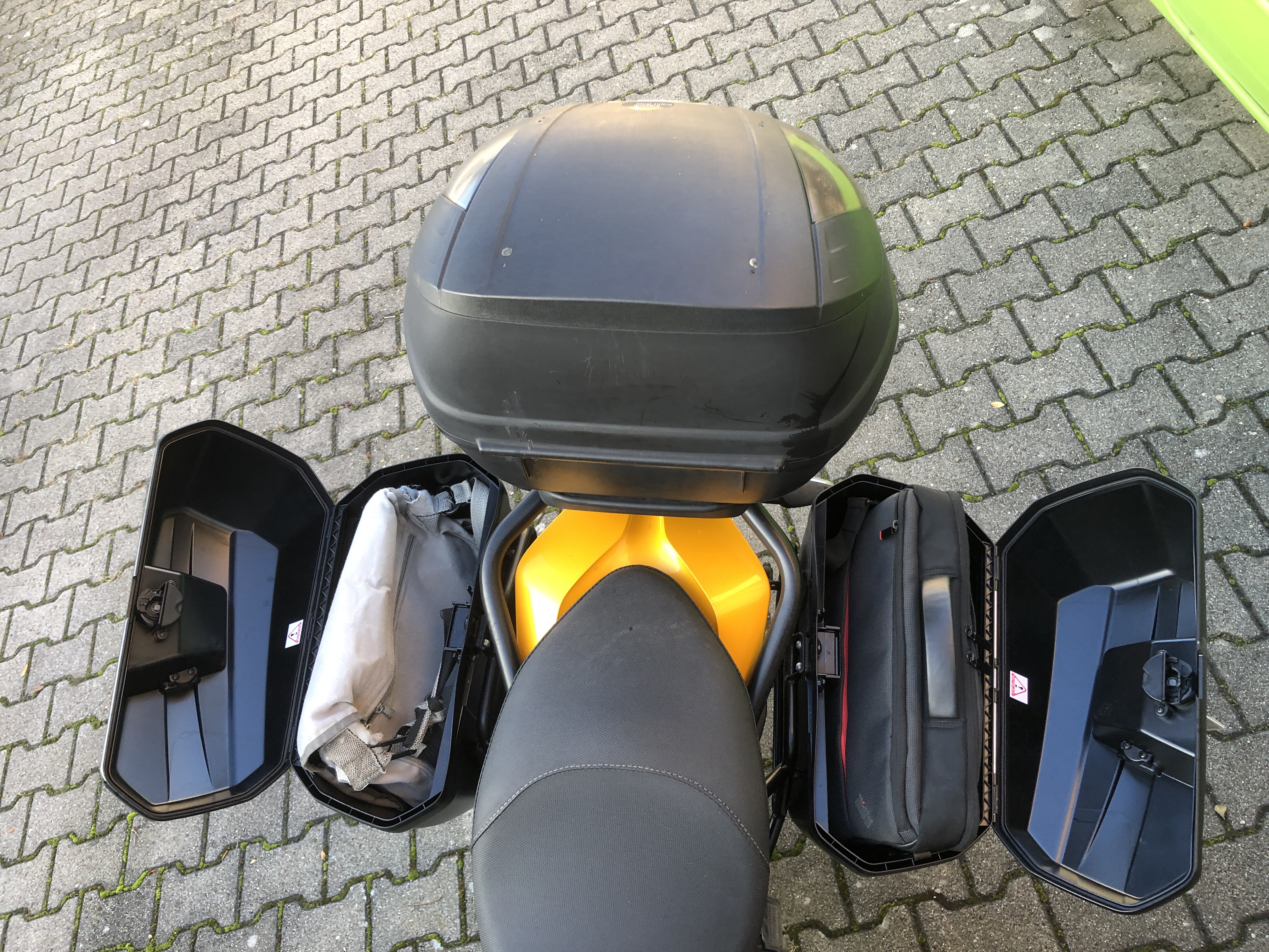Und das Beste bei alledem: Das Topcase bleibt für anderes frei :D Der Arbeitslaptop hat dort nur mit Quetschen und Drücken reingepasst....