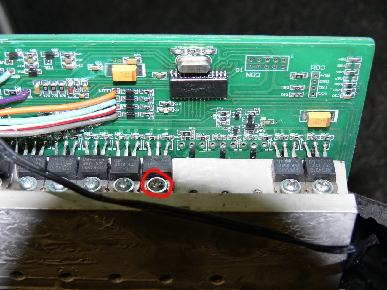 Diese Chinesischen Elektronikmonteure haben wie auf Bild 3 rot markiert zu sehen ist, beim Bohrloch fürs Gewindeschneiden (Loch fünf von links) einmal den Bohrer abrutschen lassen und eine Kerbe ins Aluminium geratscht. Ausgerechnet genau in Höhe des Gewindes, des in der Mitte liegenden geplatzten MOSFET. Den rechten und linken hat es dann auch noch direkt erwischt. Da sieht man in Wirklichkeit eine noch viel stärkere Einkerbung als auf dem Foto. Somit konnte der eine MOSFET auf Platz fünf von links gesehen, wegen des entstandenen Hohlraums vermutlich nicht richtig gekühlt werden! Die hätten das Kühlblech neu schleifen oder direkt ersetzen müssen. Echt Pfusch!