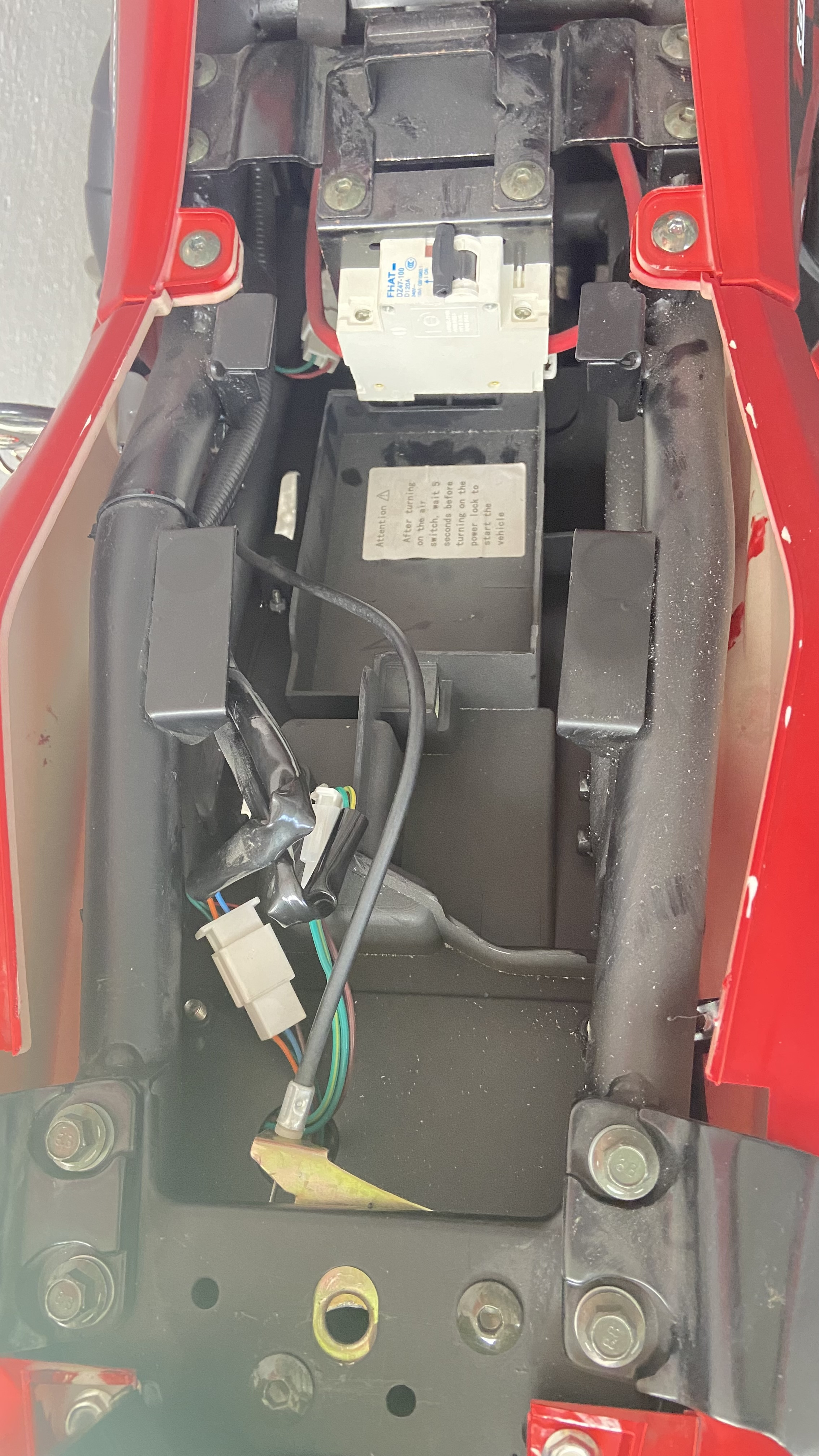 Auch kann ich auf dem Bild die Alarmanlage nicht sehen, du solltest mal die rechten Seitenteile abbauen, über dem Batteriefach hängt der Contoller