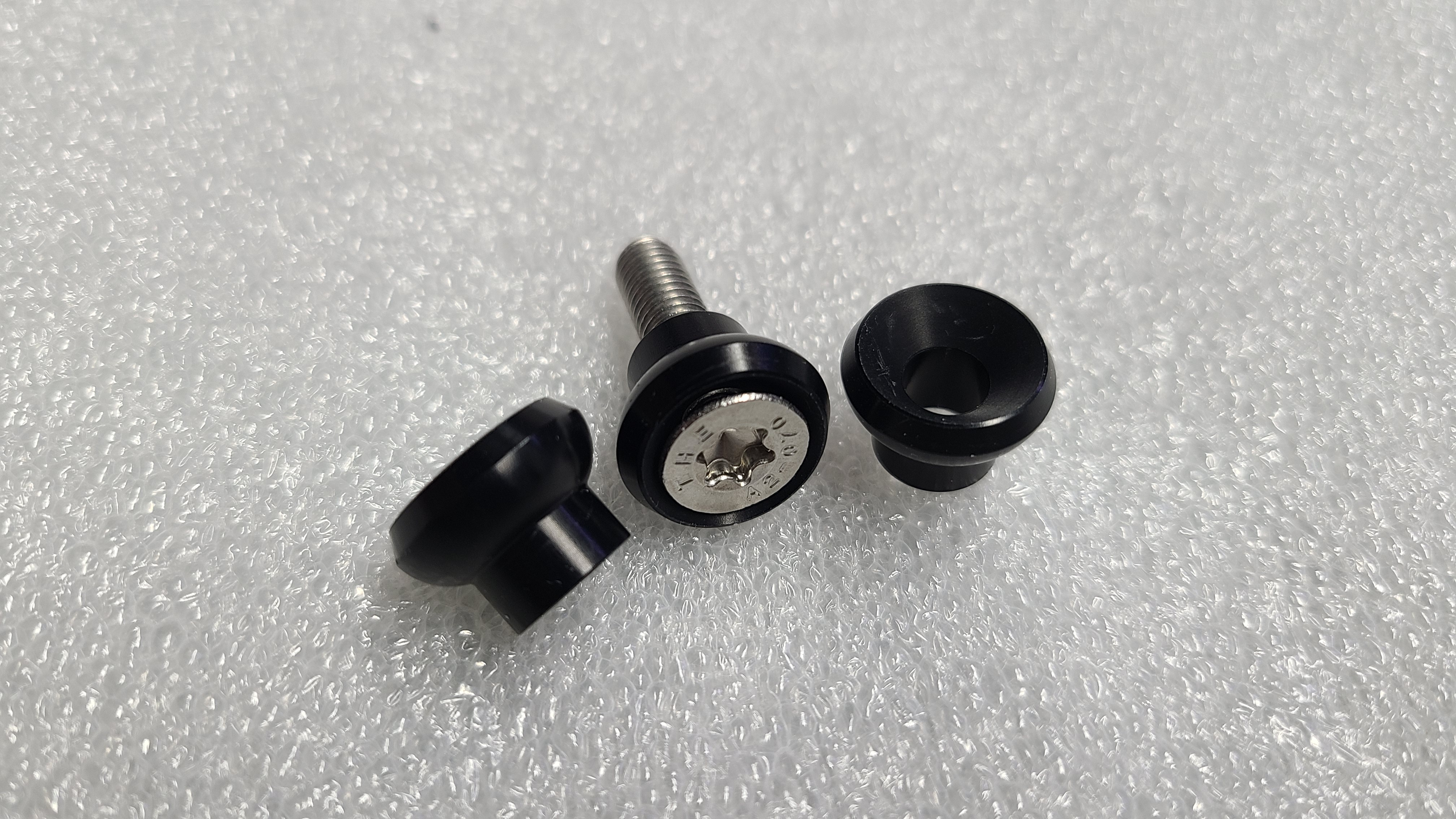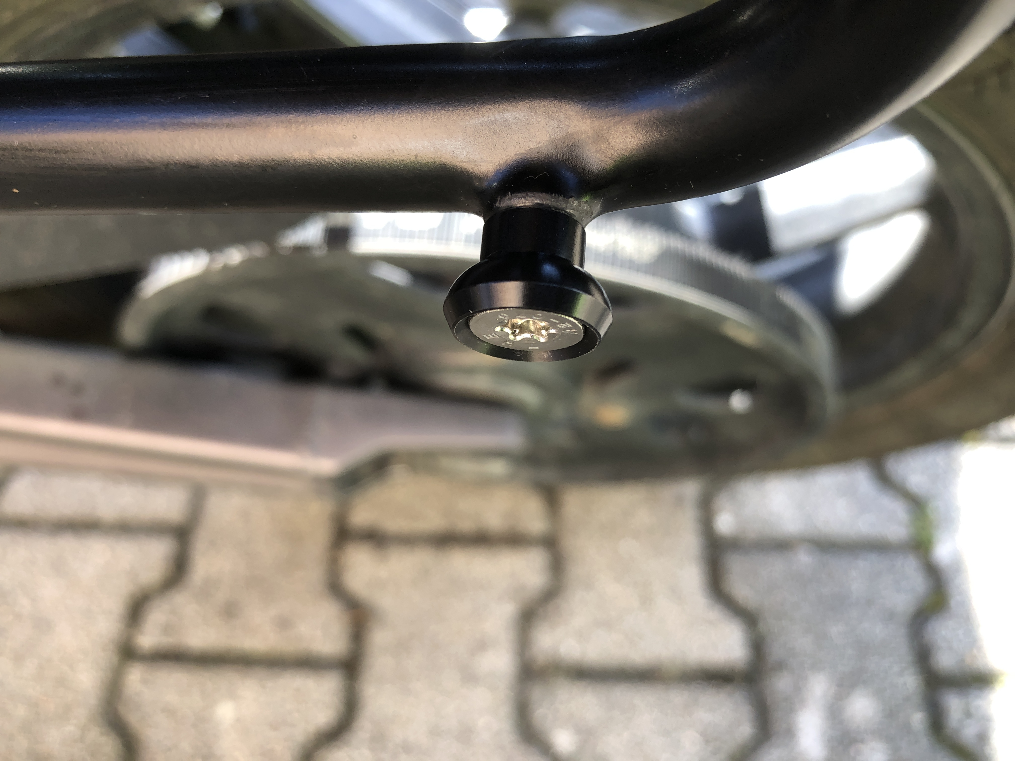 Der Kollege hat dankenswerterweise M6 Kegelkopf Edelstahlschrauben mit Torx T30 beigelegt, was ein um Lichtjahre besseres Gefühl gegeben hat beim Einschrauben der neuen, viel stabileren "Haken": _