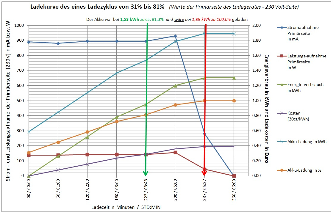 gestartet bei einem Akkustand von 31% (laut G5-Display) und ca. 0,58 kWh SOC, bis auf rechnerisch ca. 81% (83 % laut G5-Display):