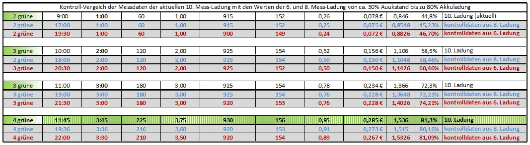 Hier ein Kontroll-Vergleich mit Messwerten von meiner 6. und 8. Mess-Ladung (ebenfalls von ca. 30% bis 80% Akkustand):