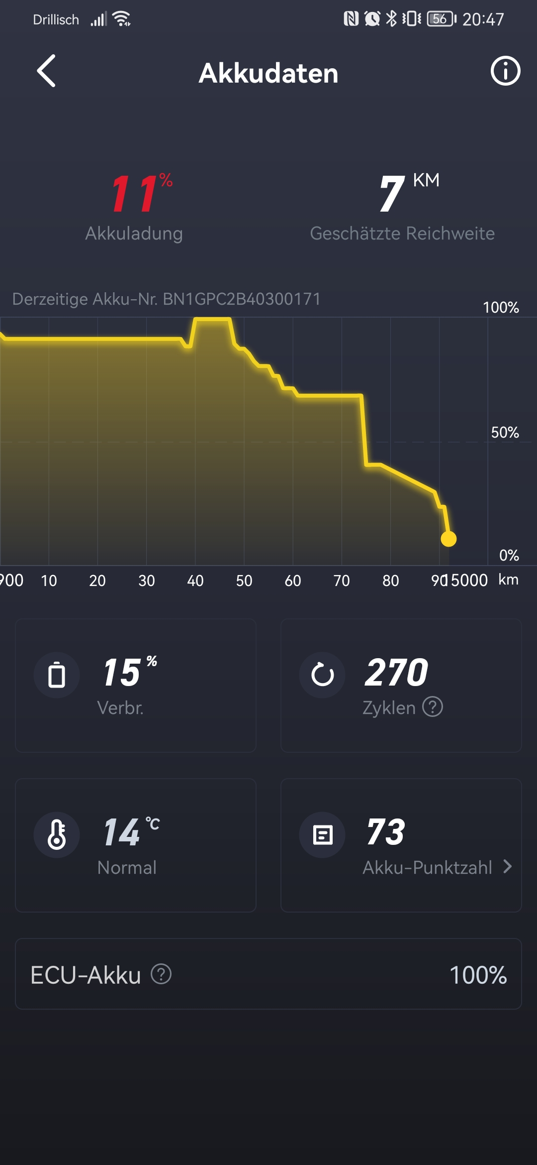 Wie kommst Du auf 4000km? 50.046km / 863 äquivalente Vollzyklen ergeben bei mir ~58km für einen kompletten Lade-/Entladzyklus, was durchaus realistisch erscheintLupo_76 hat geschrieben: Di 29. Aug 2023, 06:43 Der User Hallodri kann 4.000km ohne nachzuladen fahren? Respekt an Niu!![]()
