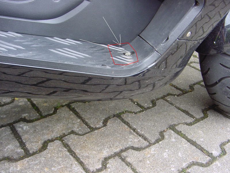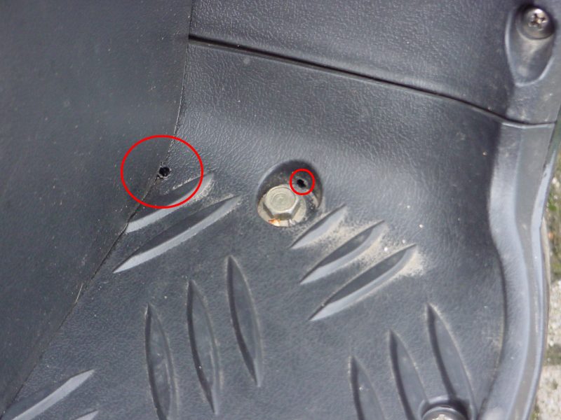 Zurück zu kleinen Detailverbesserungen an diesem Rollertyp. Diesmal sogar was ganz profanes: Wie ermöglichen wir den Seen, die sich bei Regen vorn auf den Trittbrettern ansammeln, wieder abzufließen?