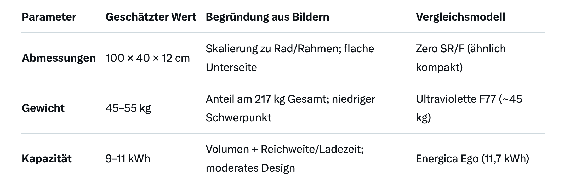 Geschätzte Batteriegewicht: Ca. 45–55 kg. Begründung: Bei einer angenommenen Kapazität von 10 kWh (siehe unten) und 180 Wh/kg Energiedichte (Standard für Motorrad-Li-Ion) ergibt sich ~55 kg. Das passt zum Gesamtgewicht und verhindert Überlastung (Batterien machen oft 20–25 % des EV-Gewichts aus). Im Vergleich: Ultraviolette F77 (10,3 kWh) hat ~45 kg Batterie bei 207 kg Gesamtgewicht.