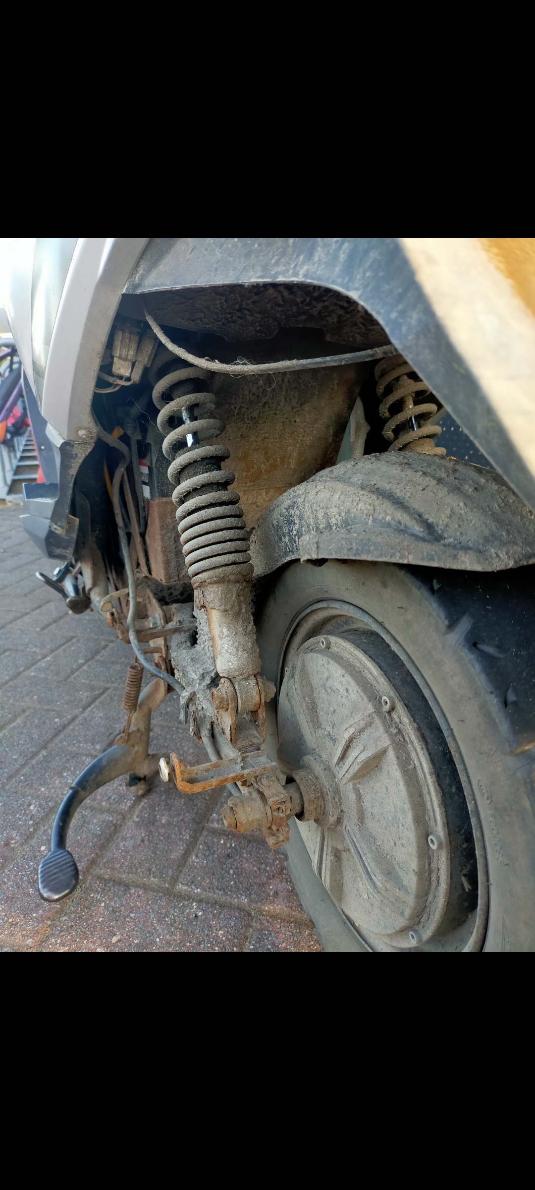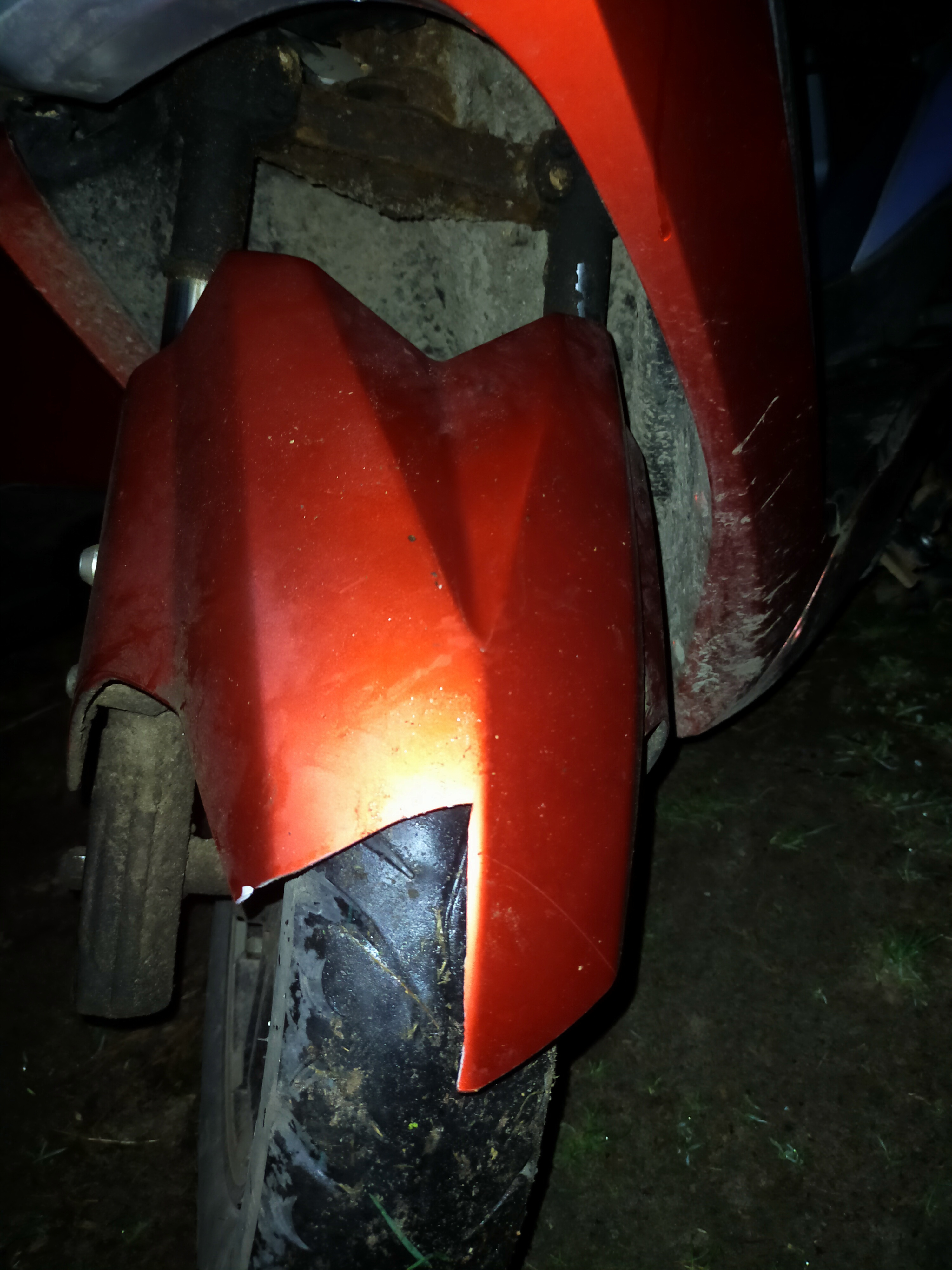 Heute Morgen, als es noch völlig dunkel war, lag ein 6 Meter langer Arm dicker Ast längs in Fahrtrichtung auf der Straße, den ich frontal rammte, sodaß er sich im Fahrzeug von vorn verklemmte und die Lenkung blockierte. Zum glück fuhr ich nur 20 km/h schnell aufgrund der Kopfsteinpflasterstraße die durch einen Wald verlief. Mein Fahrzeug wurde aufgespießt. Wäre ich schneller gefahren würde jetzt der Ast in meinem Bauch stecken. Ich wollte den Roller rückwärtsschieben, um den Ast herauszubekommen, der die Lenkung blockierte. Dieses misslang. Um Licht zu haben ließ ich den Roller eingeschaltet. Plötzlich durch zur Seite Wegrutschen des Rollers drehte ich am Gasdrehgriff und der Roller beschleunigte stark, fast auf der Seite liegend, das Hinterrad rotierend den Roller samt schwerem Ast zur Seite drehendund , fuhr frontal gegen einen Baum. Der eingeklemmte Ast brach im Fahrzeug ab und ich konnte ihn herausziehen. Die Lenkung war immer noch blockiert, bis ich es schaffte aus dem auf dem Hauptständer aufgebockten Roller, vorn das kürzere Handlänge abgebrochene armdicke Aststück herauszuziehen. Roller ist heil bis auf kleines Plastestück das an der Randabdeckung vorn jetzt fehlt. Der Bremsschlauch wurde nur leicht angeschaut.