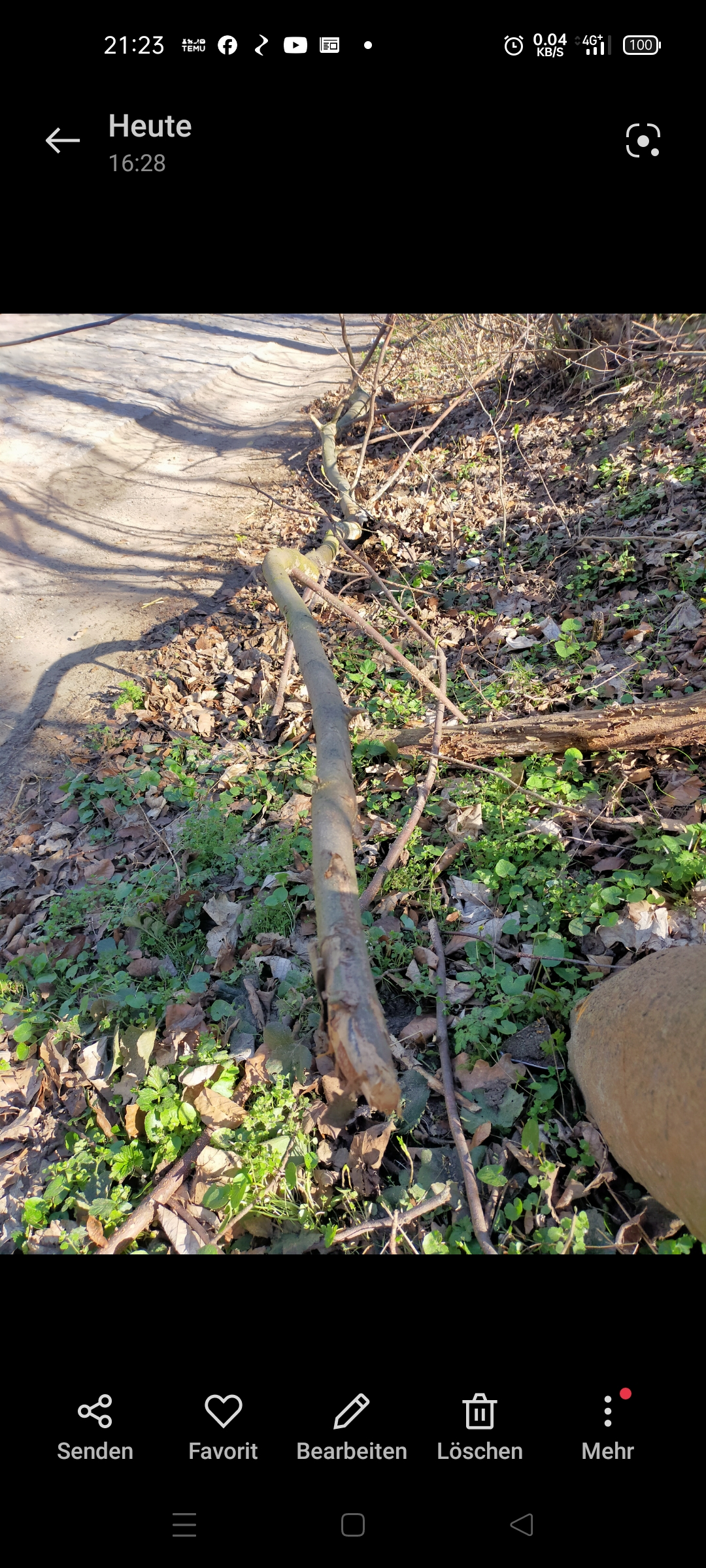 Der Ast, den ich neben die Straße legte. So längs lag er auf der Straße und spießte den Roller auf.