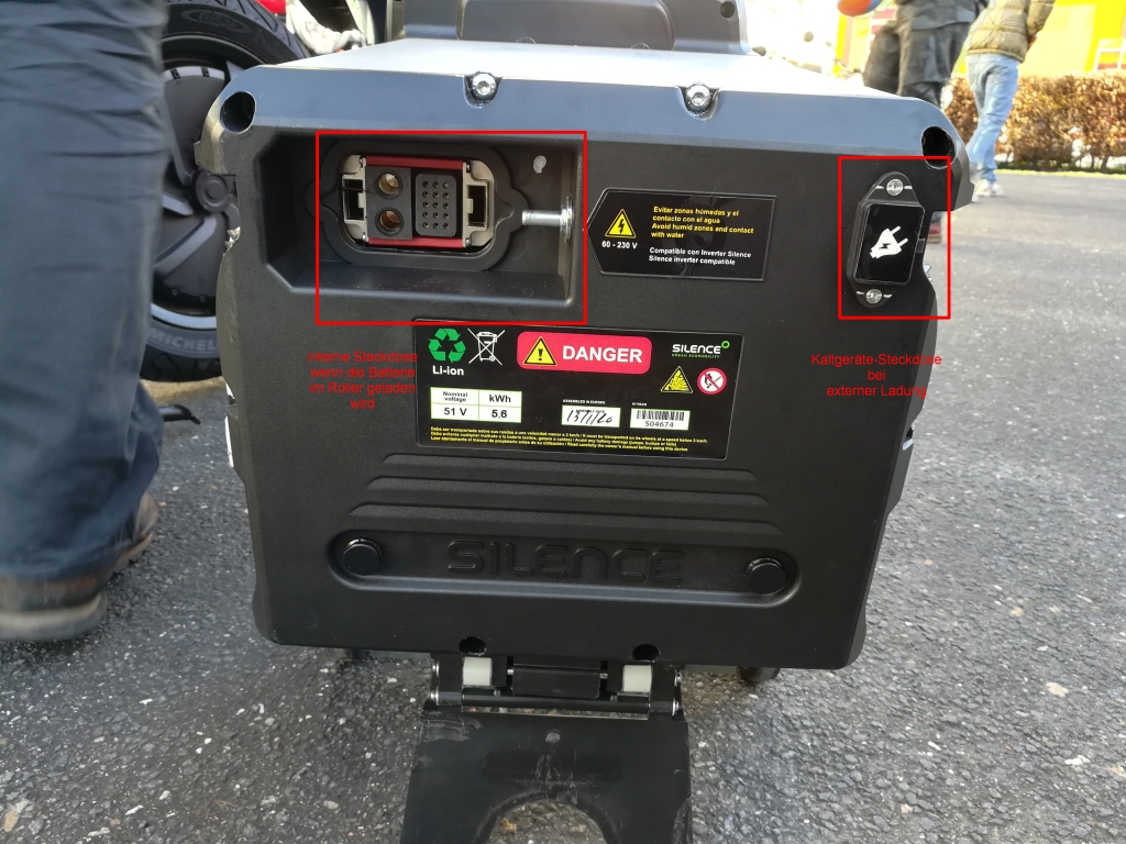 Sehe ich das richtig, dass es nicht möglich ist, den Akku im eingebauten Zustand zu laden? Der Lader ist ja scheinbar im Akku integriert, aber der Kaltgeräte-Netzanschluss für den Lader hat kein Gegenüber im Rollerfach, wie es die zwei sehr habhaften DC-Kontakte und der Datenstecker haben...