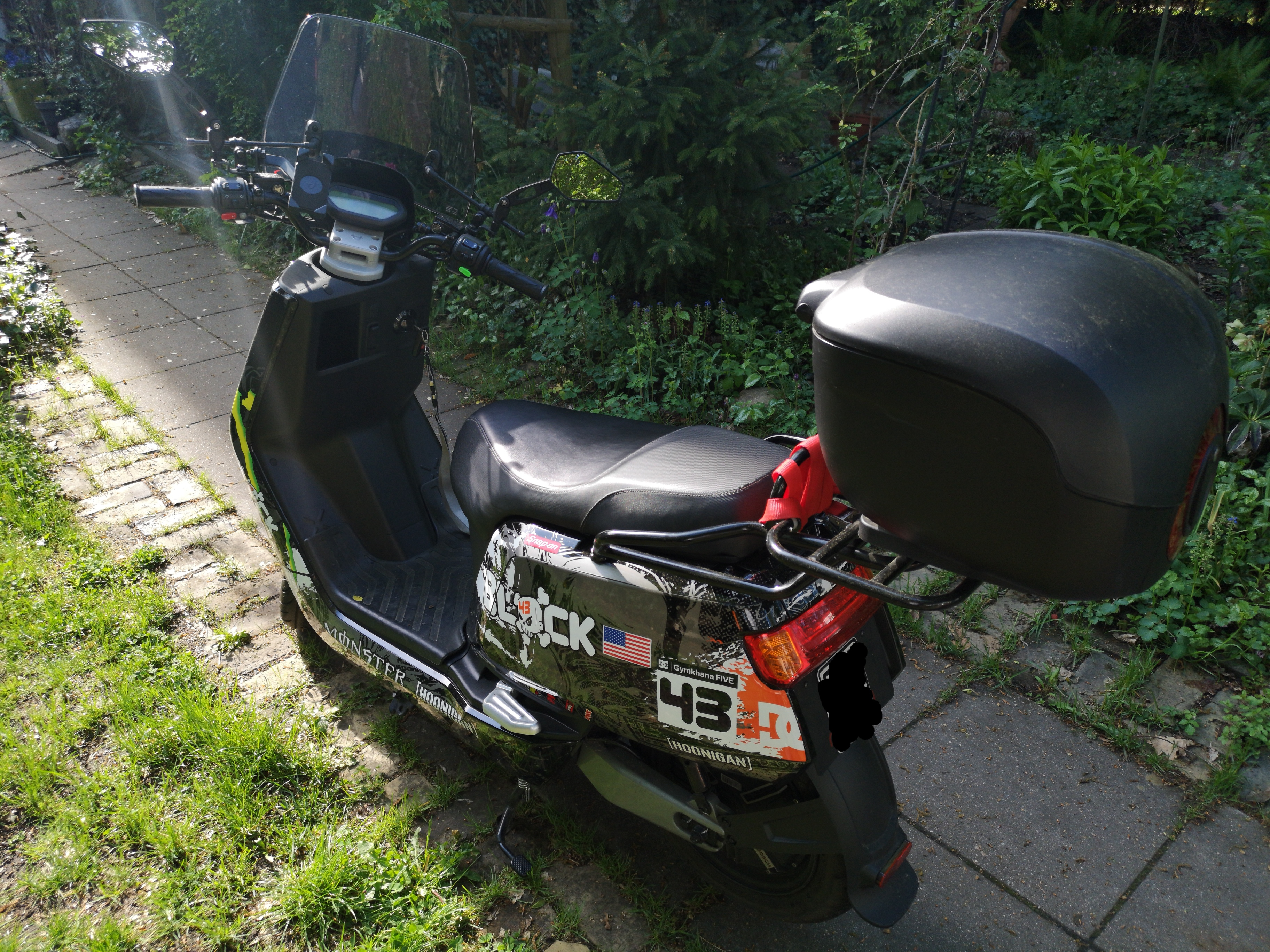Mit "leichten Modifikationen": Neue Spiegel, Windschild, Folierung, Klappbarer Gepäckträger + Topcase, Spiegelverbreiterung und veränderte Halterung für den Handyhalter. Demnächst kommt vielleicht noch eine Dashcam (in Berlin schon Sinnvoll) und eine Feder um den Sitz hochzuklappen.