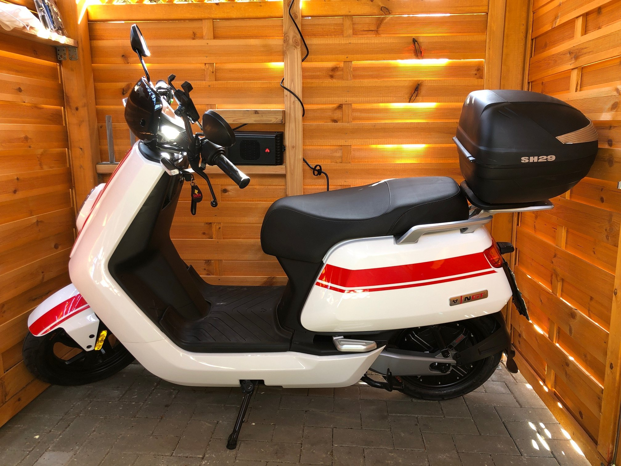 Der Bikeport, der einmal für einen NIU M1-Pro gebaut wurde, beherbergt nun einen N-GT - natürlich mit dem Koffer hinten drauf.