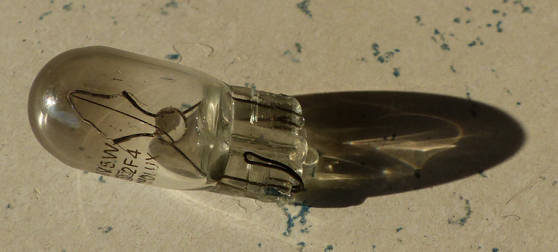 Es war schon ziemlich finster im Glaskolben vom niedergelassenen Wolframdampf der Glühwendel: Das Ding steckte in einer Gummifassung. Genauere Inspektion zeigte keine Unterbrechung der Glühwendel, also habe ich die zwei Drahtenden etwas nach außen geklappt und wieder in die Gummifassung geschoben. Und siehe da, das Rücklicht ging wieder, das Bremslicht oben blieb aus und ging nur beim Bremsen an, so wie es sich gehört. Da aber der endgültige Exitus der Lampe sicher nicht mehr lange auf sich warten lassen würde bin ich doch zur Tankstelle und habe eine neue 12V 5W W5W Birne gekauft (für das kleine Scheißerchen musste ich € 2,50 löhnen!) und ins Rücklicht eingebaut. Im September steht die nächste HU an, da ist dann zumindest die Rückleuchte am Leben