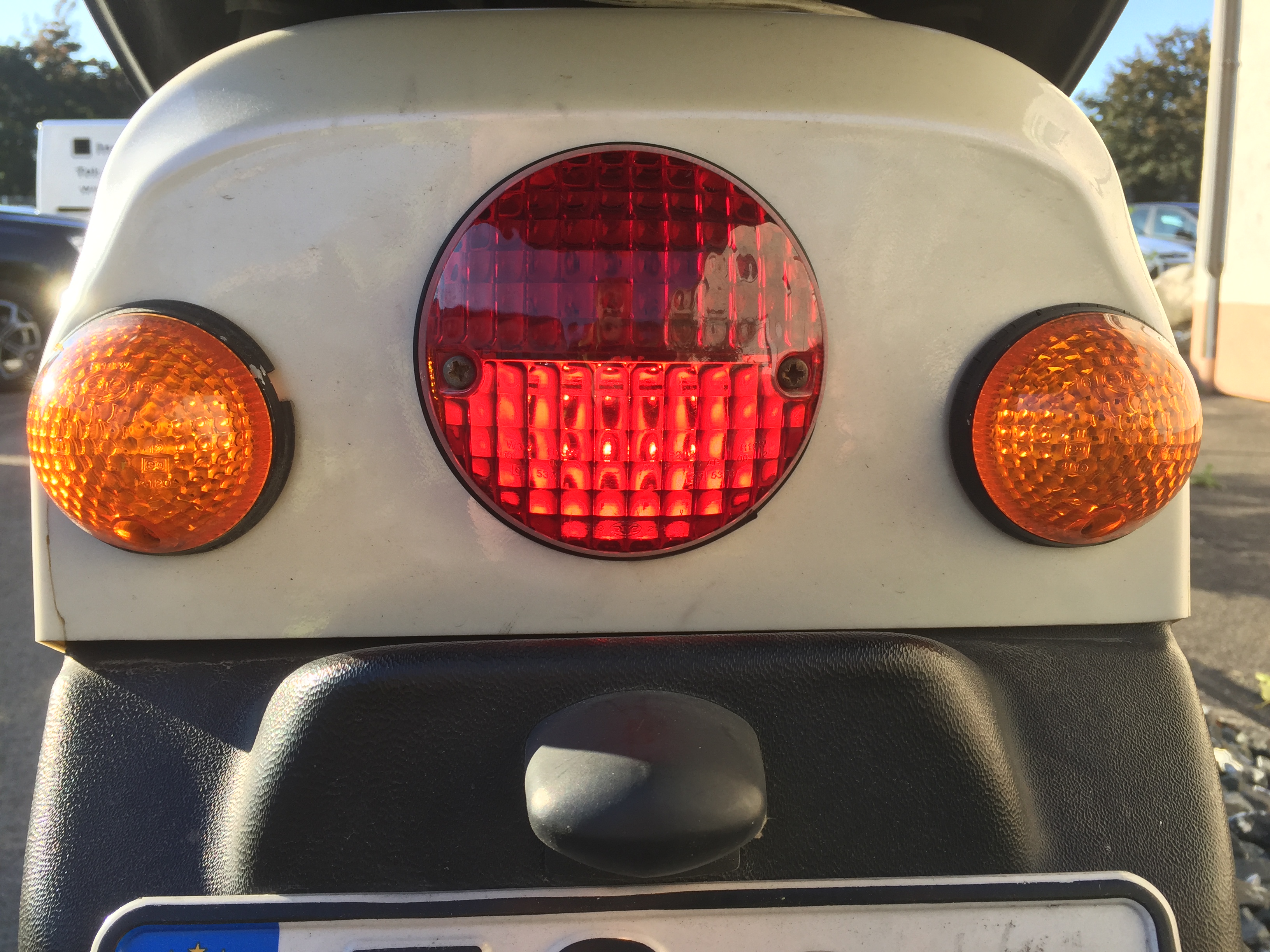 Zuhause ließ ich die Kiste erst mal an und untersuchte die gesamte Beleuchtung. Dabei fiel auf, dass die untere Hälfte der runden Rückleuchte immer dunkel blieb. Die obere Hälfte war beleuchtet, aber beim Bremsen wurde die obere Rückleuchte nur marginal heller.