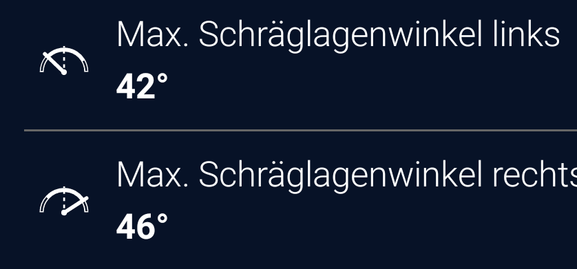 Derartige Schräglagen habe ich bei normaler Strassenfahrt auch nicht. In normalen schnelleren weiteren Kurven ist man davon weit entfernt.Kadett 1 hat geschrieben: Mi 5. Apr 2023, 21:52 Ich hab nur wenige fahrten aufgezeichnet und erst dieses Jahr damit angefangen, mehr als 31° Schräg war ich bisher nicht. Ist also noch genug mindestens bei mir.