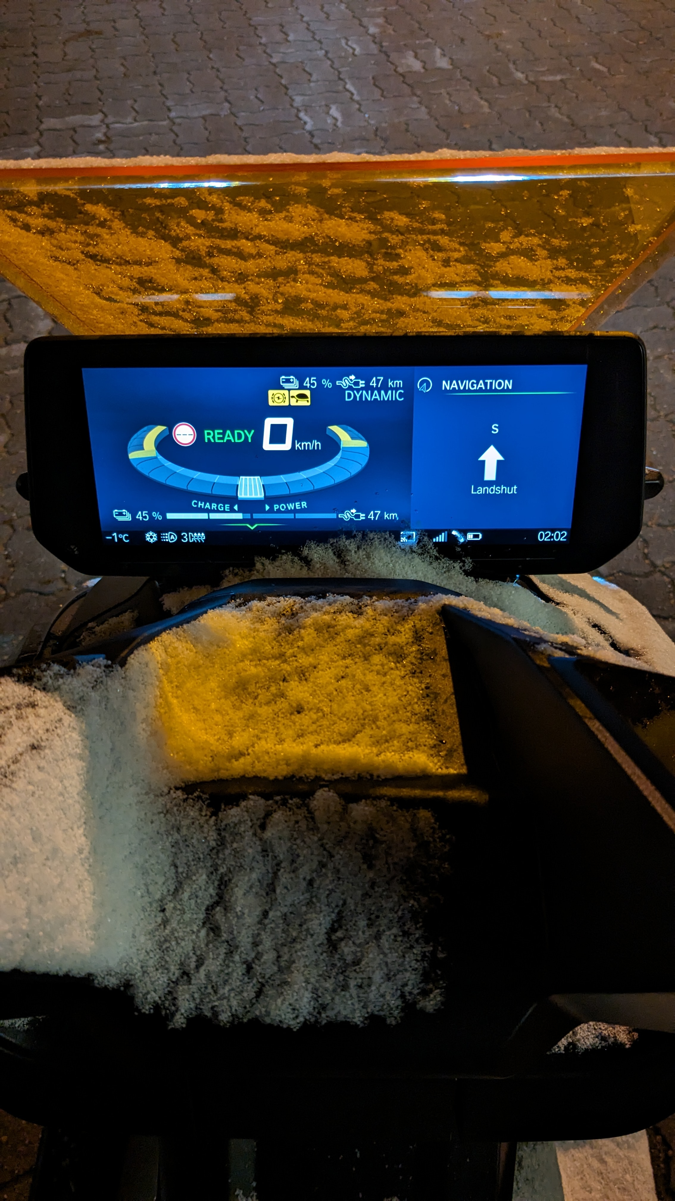 Bei leerem Akku und -1 Grad bergauf nur noch 85 km/h. Auf dem Heimweg Akku voll bei-4 auch mal kurz die Meldung Rekuperation dann ging auch Vollstoff.. :geek: Meine Zeige/Ringfinger waren etwas angefrohren nach 30min. Egal den Bauernstreik konnte ich umgehen bzw. hab mich durchgemogelt. ;)