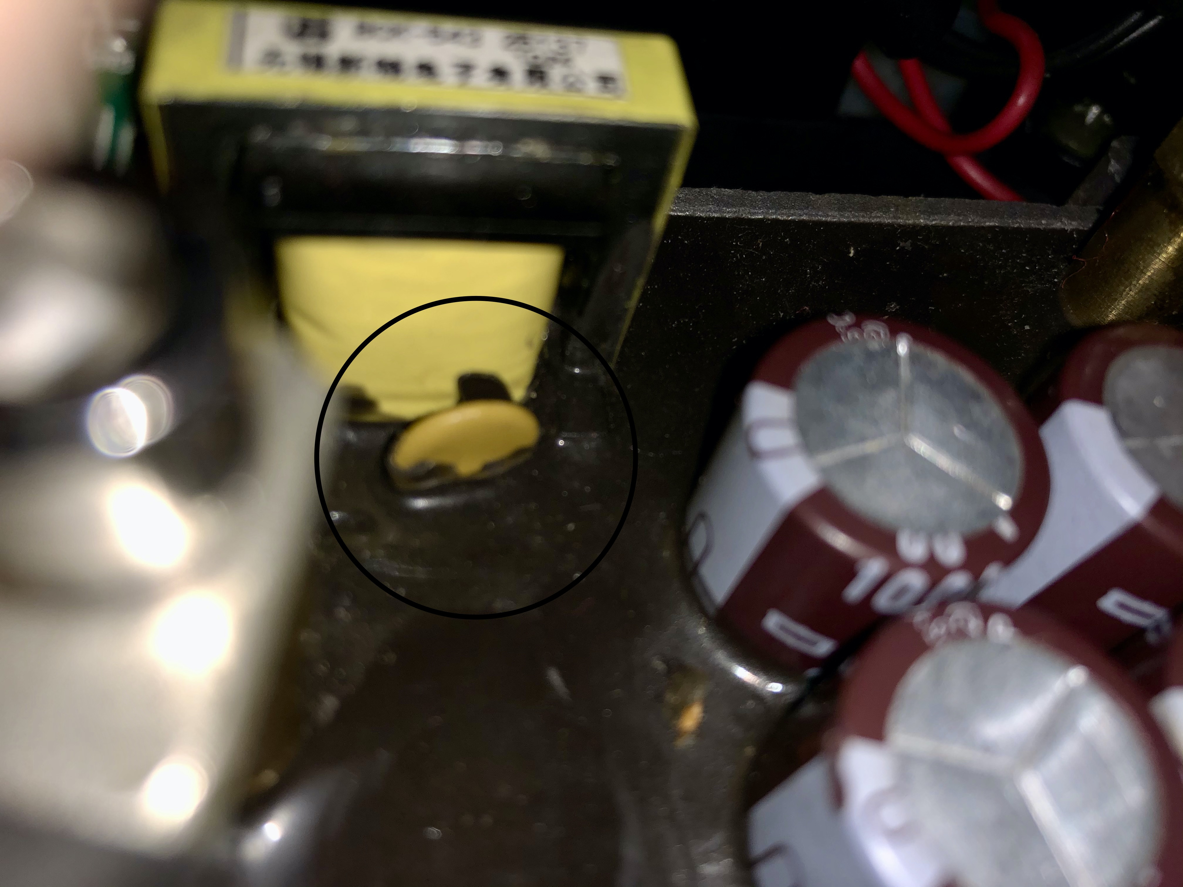 Ich habe auch noch den auf dem folgenden Bild zu sehenden runden Transistor?! von der dahinter liegenden großen gelben Spule weggebogen.