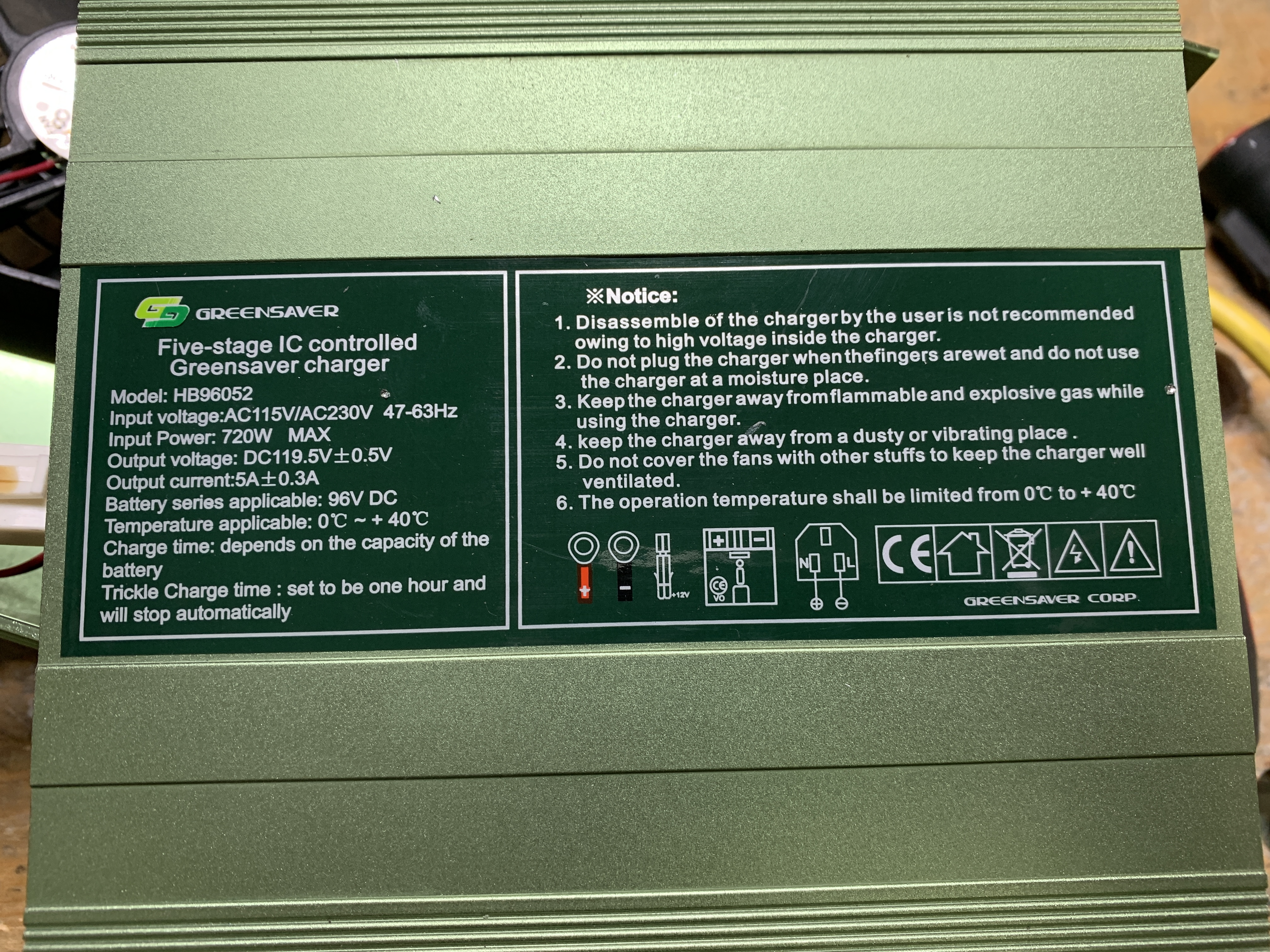 Dies ist ein 5-Stufen-Lader von Greensaver - dieser ist wohl defekt, da keine Lebenszeichen mehr. Damit ein richtiger Lader mit Konstant-Strom-Spannung-Ladung. Der Rest wie Sicherungen, das Schütz usw. sind eigentlich gleich angeschlossen.