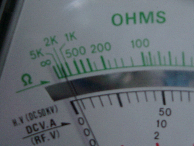 (=> Zeiger schlägt nach rechts auf 0 Ohm aus - Skala umgedreht?!)
