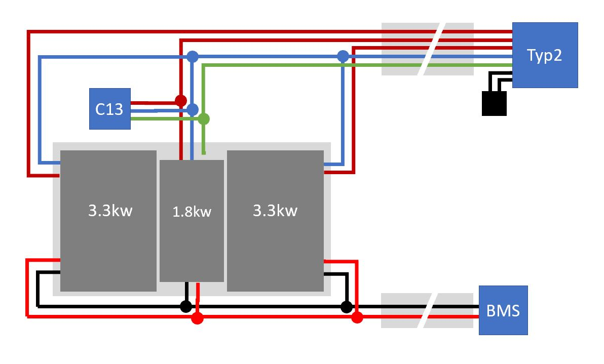 Eigentlich ziemlich genau Deine Idee, aber halt mit drei 3,3kW Ladern unten dran.