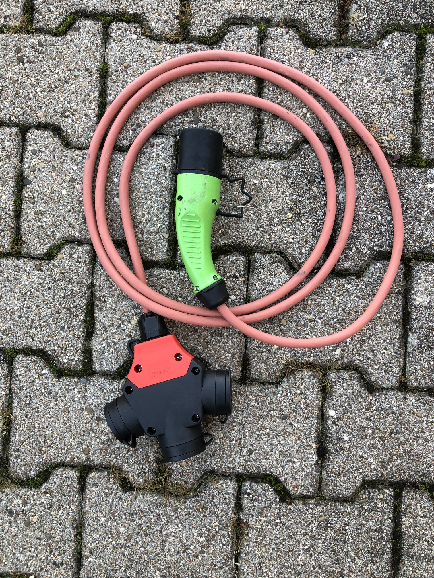 Hier nun die gestern versprochenen Bilder, wie mein Ladekabel mit Typ2 Stecker von Evalbo und jetzt dem besagten 3-Phasen-3-fach-Schukoadapter von