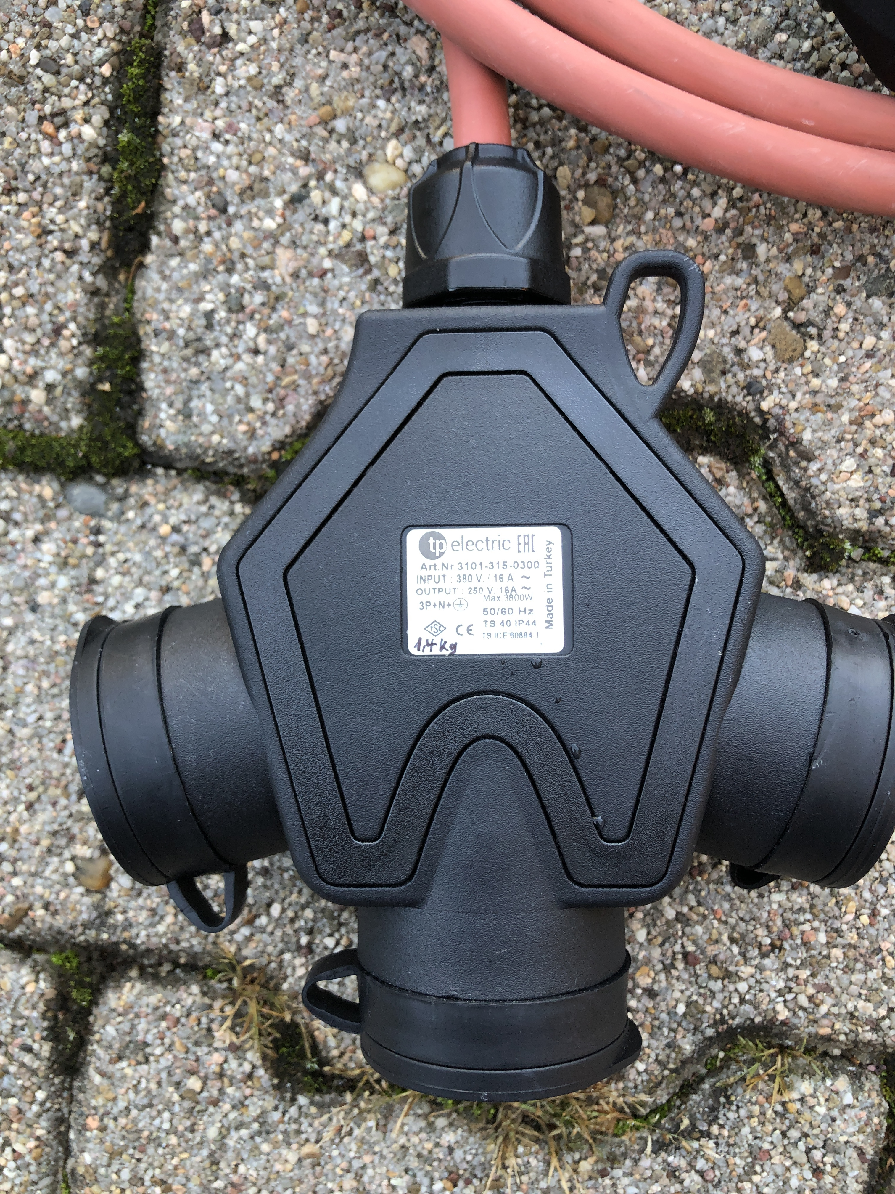 habe ich mir die sehr kompakte, von ihm verwendete 3-Fach 3-Phasen auf Schuko Dose von TpElectric bestellt: