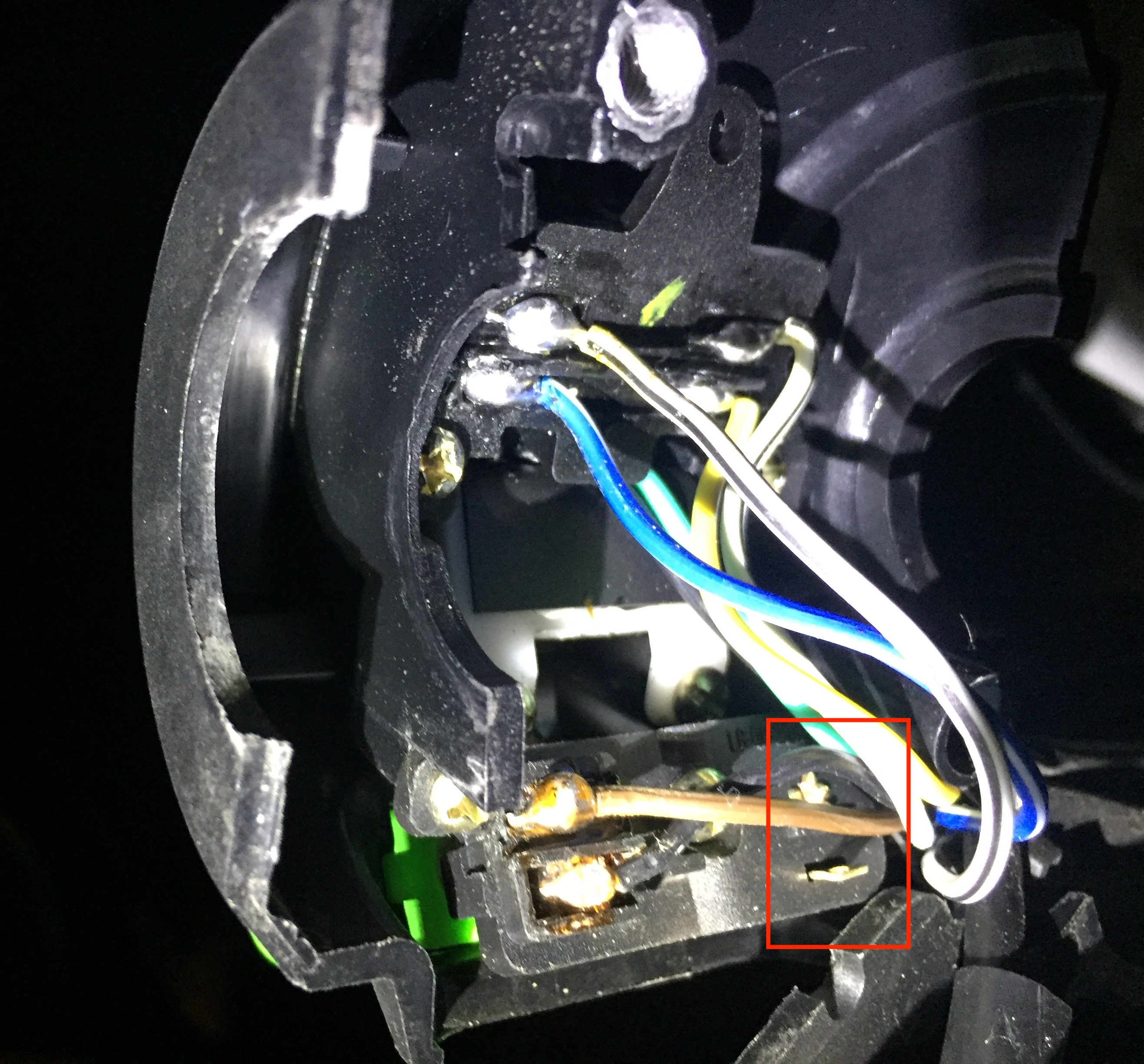 Ich habe das Gehäuse auch abgeschraubt und dadurch geöffnet, hier folgte auch die Bestätigung, dass hier schon ein Teil eines Tasters existiert. Hier sind nämlich bereits die zwei zugehörigen Lötkontakte ausgeführt (und noch frei):