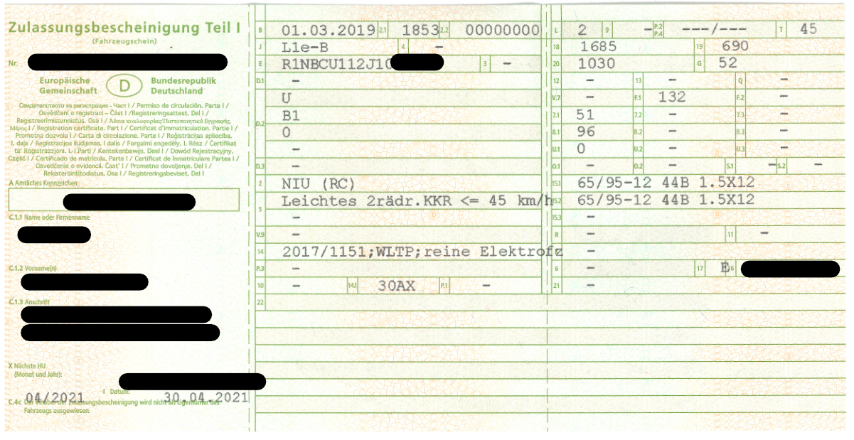 Angehängt habe ich meinen Fahrzeugschein. Ich hoffe ich habe nichts persönliches Vergessen zu schwärzen - sollte es Bedarf an einer ungeschwärzten Version für eine Anmeldung oder so geben teile ich diese gerne im kleinen Kreise.