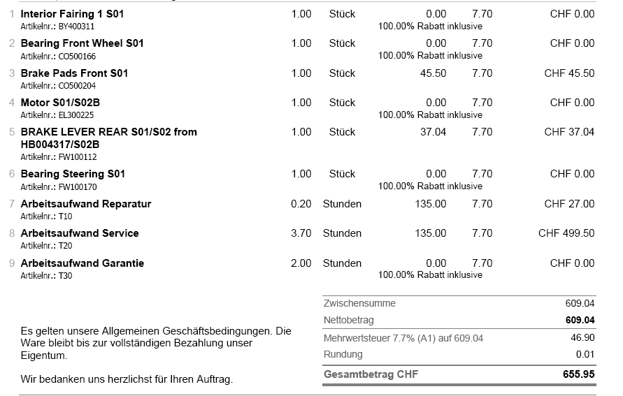 Für die Garantiesachen wurde ja gar nichts berechnet, das ist ja nur der Bremshebel und die Inspektion! Für fast 600€?