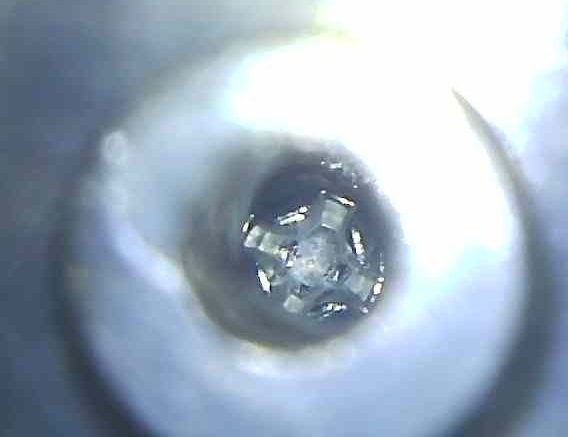 Ich wollte schon aufgeben, dann ist mir mein Taschenlampenvorsatz für tiefe Löcher wieder eingefallen. Damit konnte ich dann den Kopf einer Kreuzschlitzschraube sehen. PH0 passt. Scheinwerfer in den Kugelkopf-Schraubstock und sowohl mit Abblendlicht als auch mit Fernlicht an der Schraube gedreht. Keine Änderung erkennbar. Es fühlt sich so an, als sei das keine Einstellschraube sondern eine Befestigungsschraube. Rechts rum gibt es einen Anschlag, links rum geht es immer leichter.