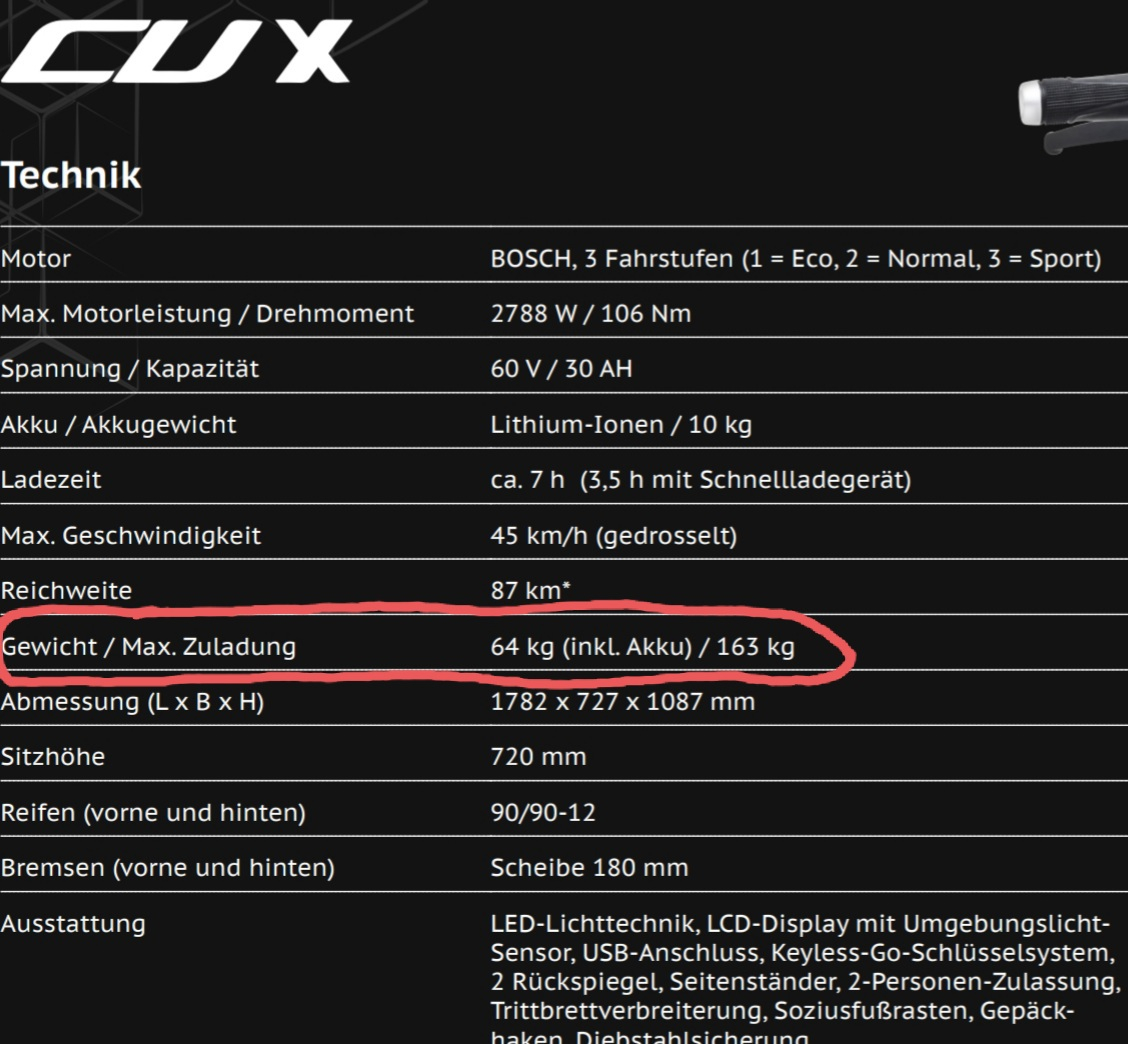 Da gibt es auch Techn. Daten: Zul.Gesamtgewicht 227kg - ich gehe jetzt nicht davon aus, daß der Roller leer auf 40-50kg abgespeckt wurde... :mrgreen: