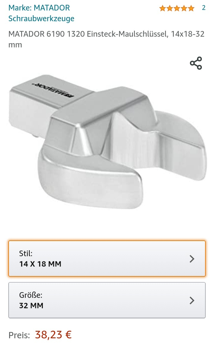 Hab's gefunden: müsste wohl ein Einsteck-Maul-/oder Gabelschlüssel sein. Muss aber erst mal sehen, ob das in den neuen 1/2 Zoll Drehmomentschlüssel passt. Gibt wohl drei verschiedene Größen und bei dem 32er braucht man wohl mindestens die mittlere. Leider sehe ich das nicht beim Bestellen des Drehmomentschlüssels. Bei einem war es zwar angegeben aber der hatte die kleinere Öffnung. Preislich finde ich das Teil von Matador bis jetzt auch nicht besonders verlockend. Vielleicht wäre ein Set lohnenswert.